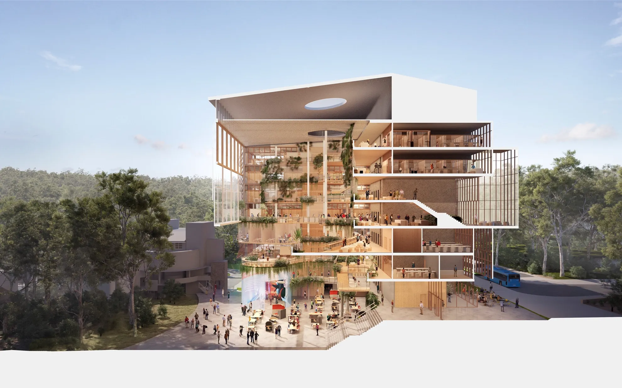 Addressing the central void are a variety of informal learning and event spaces, green terraces and balcony break-out areas.
