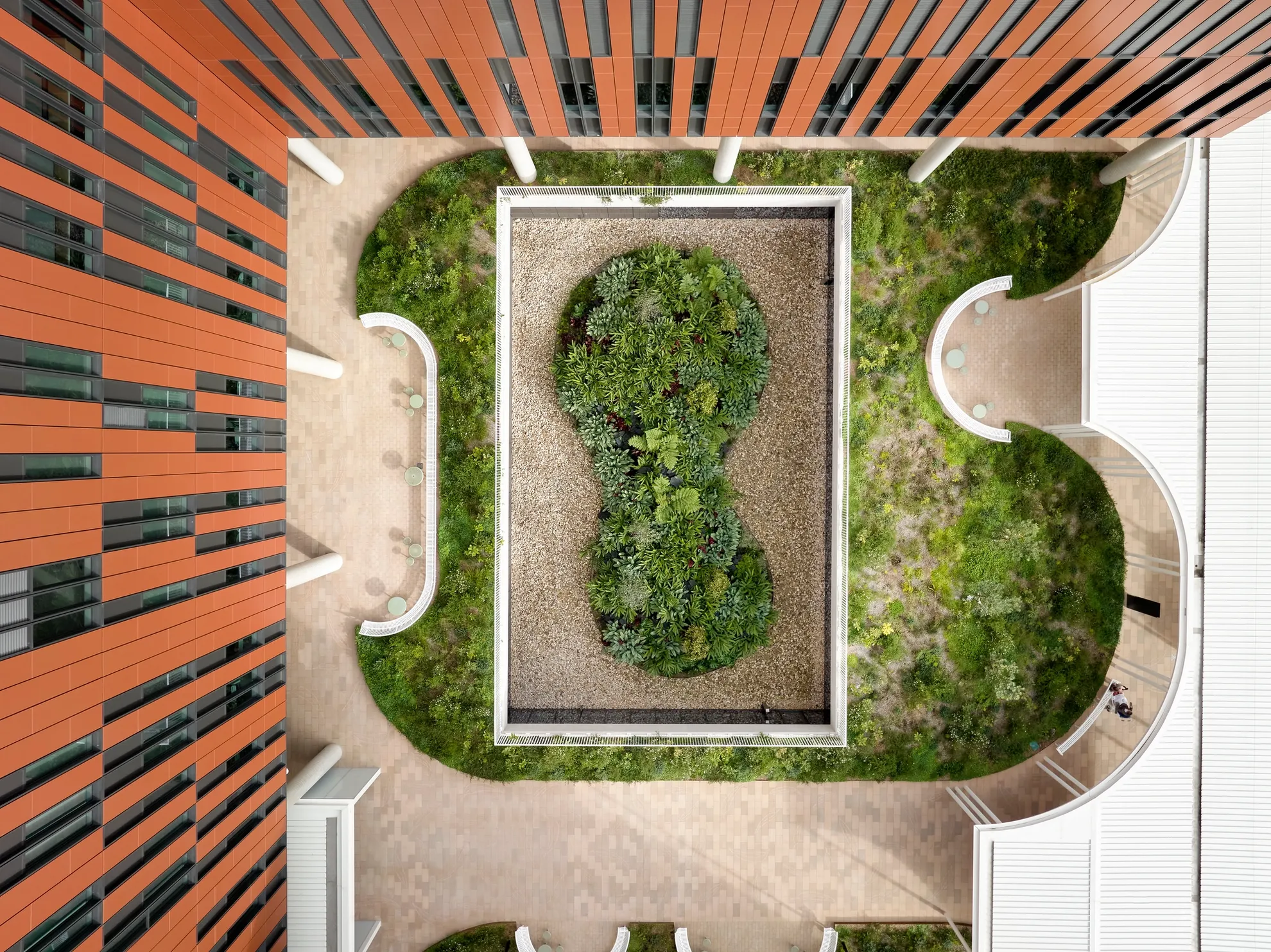 Wrapping the courtyard, a colonnade promotes active use of outdoor spaces, blurs the building’s edges, and extends the garden outlook into the double-height foyer and tenancies. Designed as a series of vertical elements, the ASB’s U-shaped form reads at a civic scale without being imposing. Its mass is modulated through changes in materials and levels. Shadow play from external blades enlivens the exterior throughout the day. Upper terraces reduce bulk and offer staff-landscaped spaces for outdoor enjoyment.