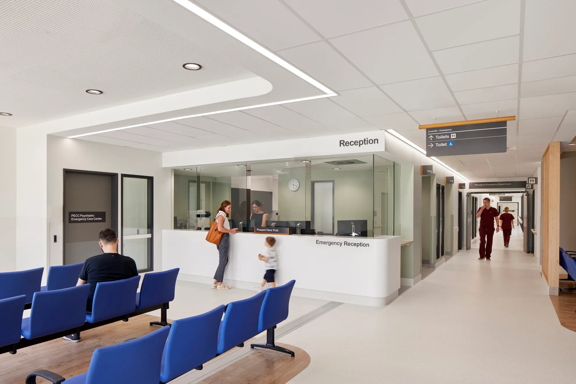 Clarity, accessibility and efficiency improvements are key drivers. The master plan introduces two link bridges to improve connection into the existing hospital campus and lowers Hospital Road to separate ambulance, vehicle and logistics access from general entry. Through this strategy, we created a new Botany Street frontage. Now, the main arrival and ASB experience is orchestrated around a central landscaped courtyard – with a sunken garden – delivering natural light and a tranquil setting to the heart of the project and the new Emergency Department.