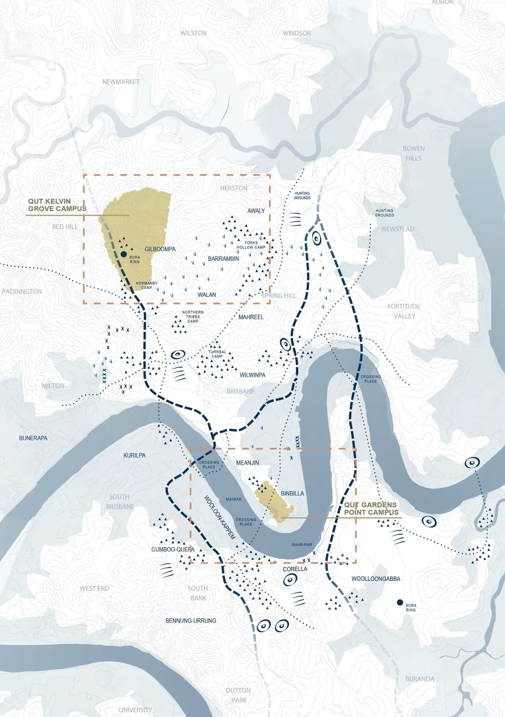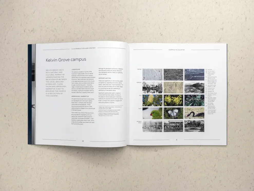 Campus to Country: Positioning Strategy is a spatial framework that seeks to inform future development at QUT's Kelvin Grove and Gardens Point campuses by engaging with Turrbal and Yugara peoples Country.