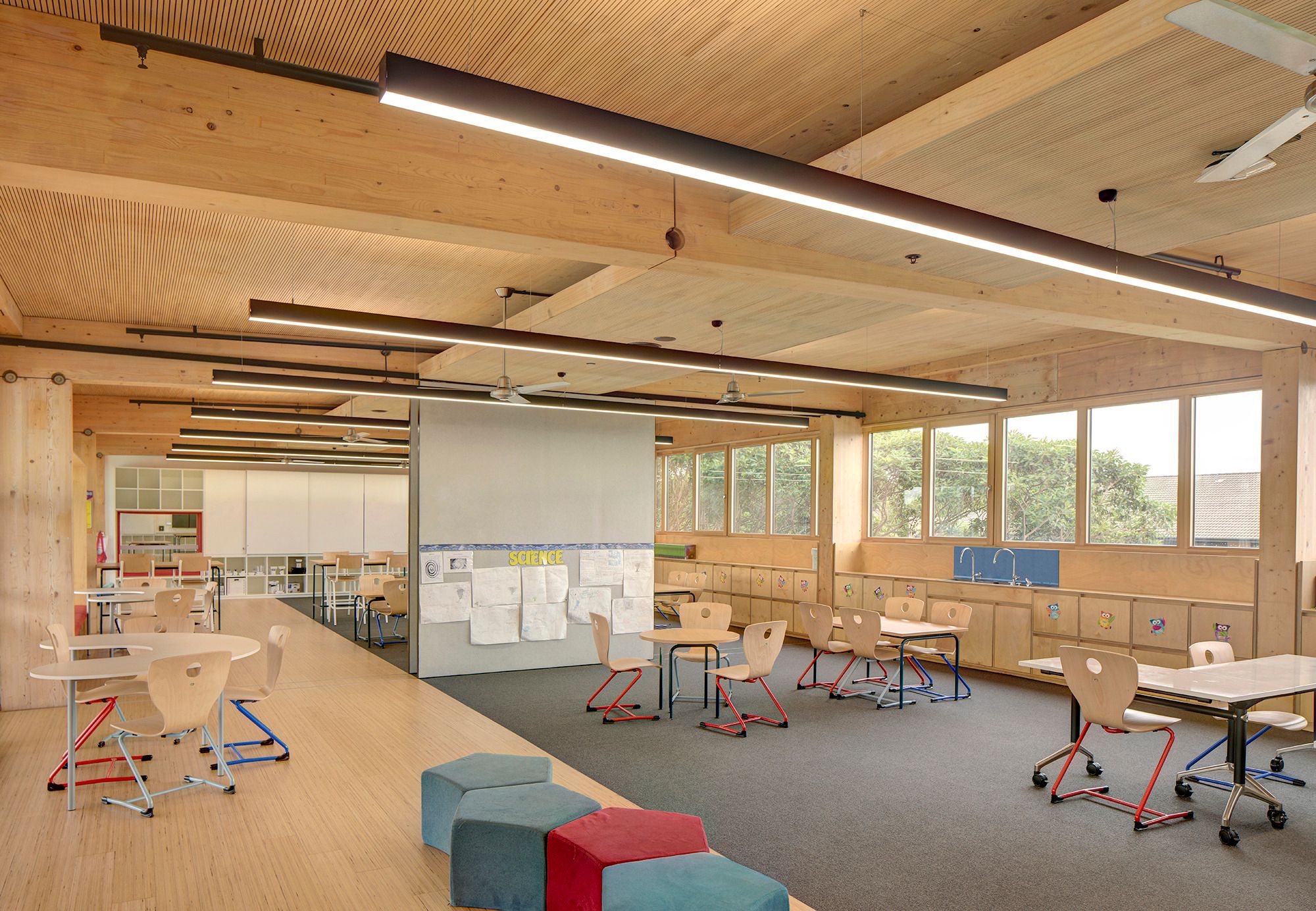 A large timber staircase laces through each level and connects class levels with a broad range of school facilities. There is a school library complete with a suspended reading net, administration areas and verandas. Outdoor playgrounds can be found on level 3 and on the rooftop. By removing most of the internal walls from the existing structure, class groups can gather either side of an open timber corridor that runs the length of the building. The design enables a diverse range of configurations for students to have an active role in their learning experience. Movable furniture such as beanbags and desks on wheels plus floor to ceiling sliding screens allow students and teachers to customise spaces to suit learning needs.