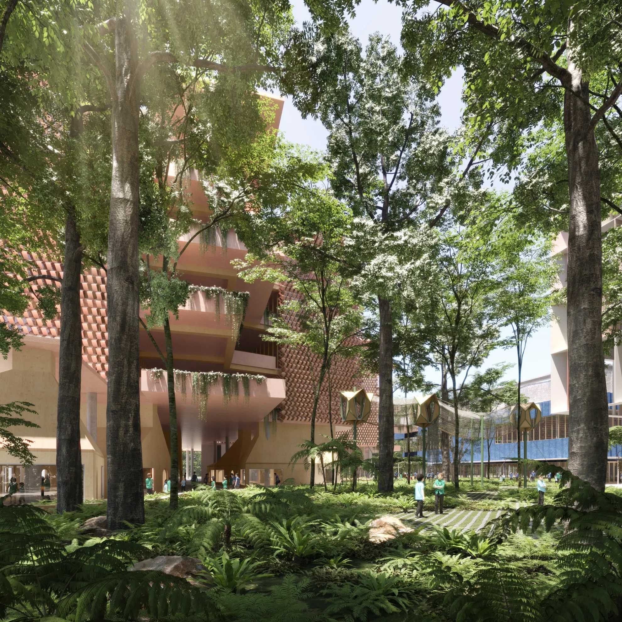 Landscape is foundational to the garden campus, where settings for learning, play and community coalesce in harmony with nature. The site's remnant forest will be preserved, celebrated and extended to the building edges. A green spine will weave through the college, connecting shaded walkways and open play areas, defining places to rest, reflect and connect with the outdoors.