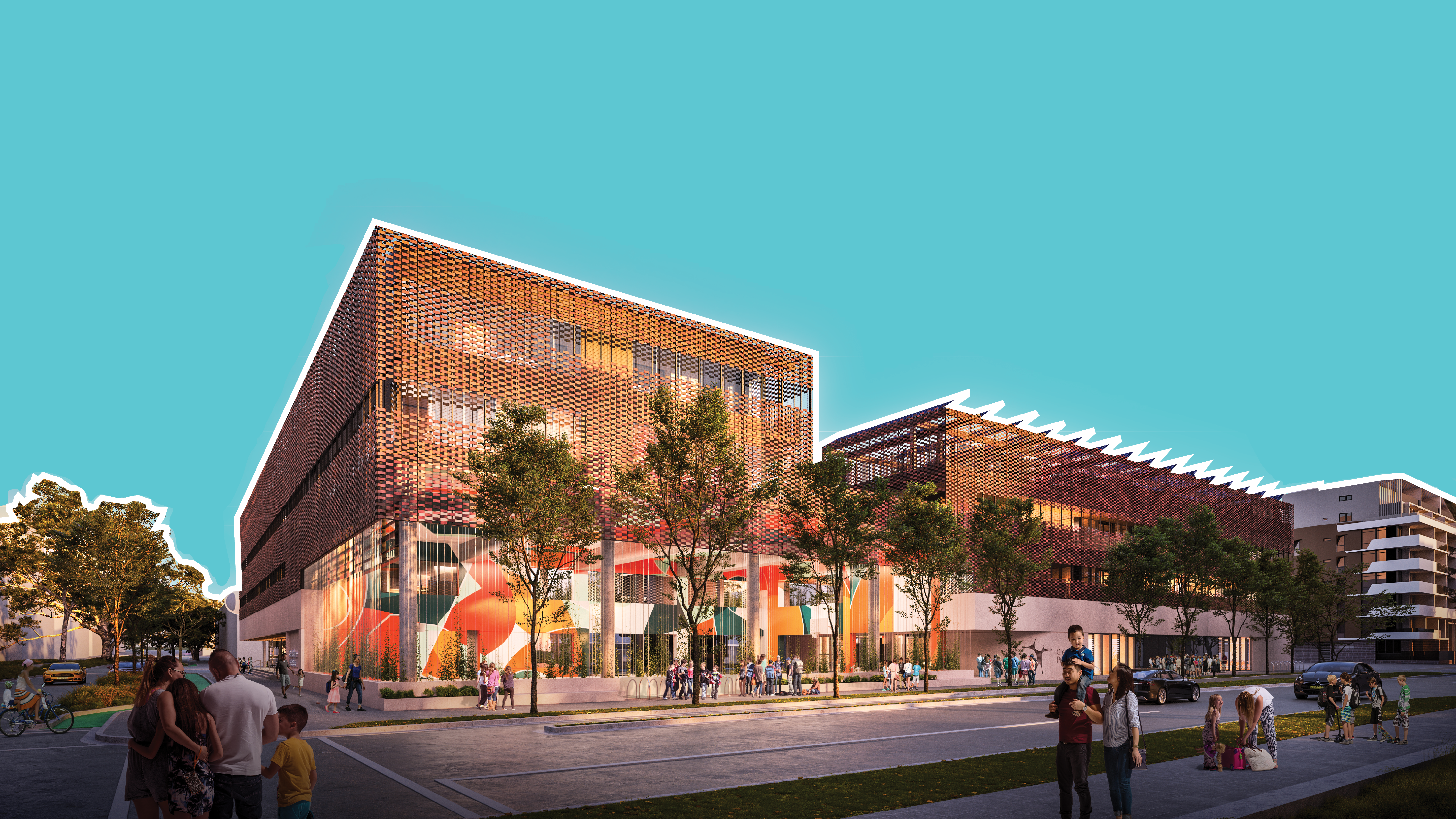 Designed to feel both safe and playful, the school welcomes children and families while supporting broader community functions and gatherings with active street frontages that energise the precinct. Layered with artwork and landscape and enriched by contemporary learning environments, the landmark school and community facility ensures children and all-ages can safely access spaces to play, learn, gather and grow.