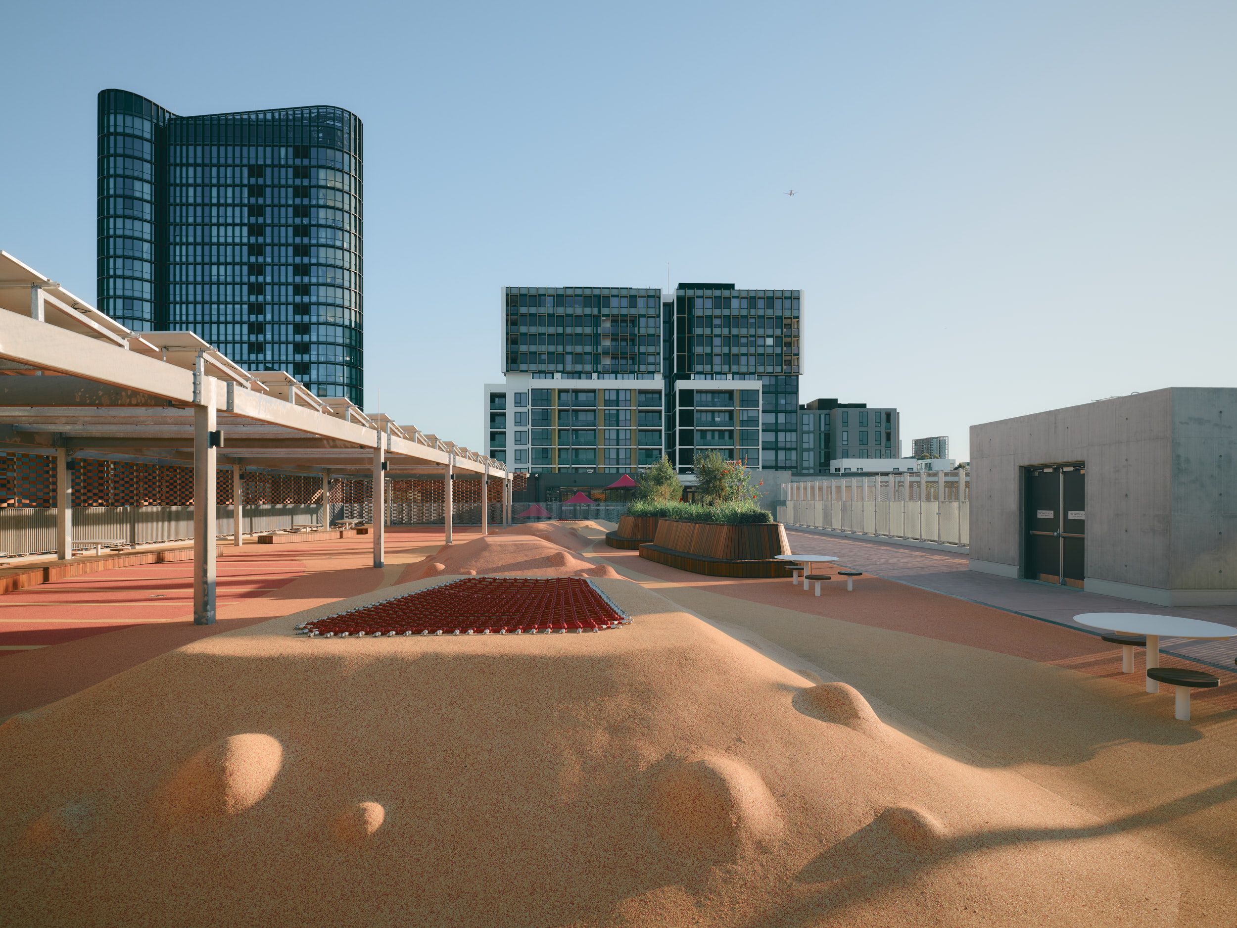 The rooftop engages little learners with active playscapes.