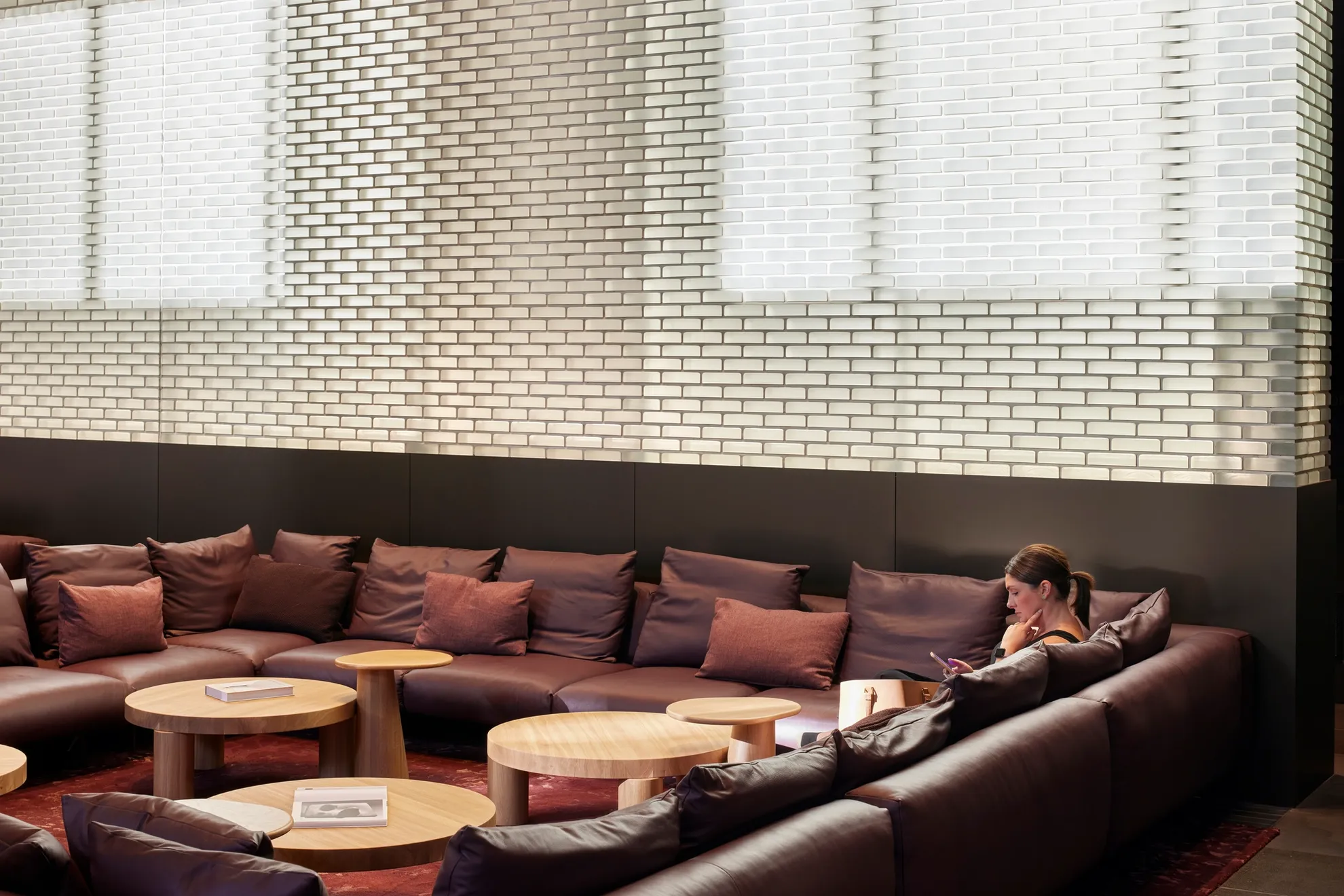 The centre is defined by the textured glow of a full height glass brick wall, a dramatic backdrop to the café and working lounge.