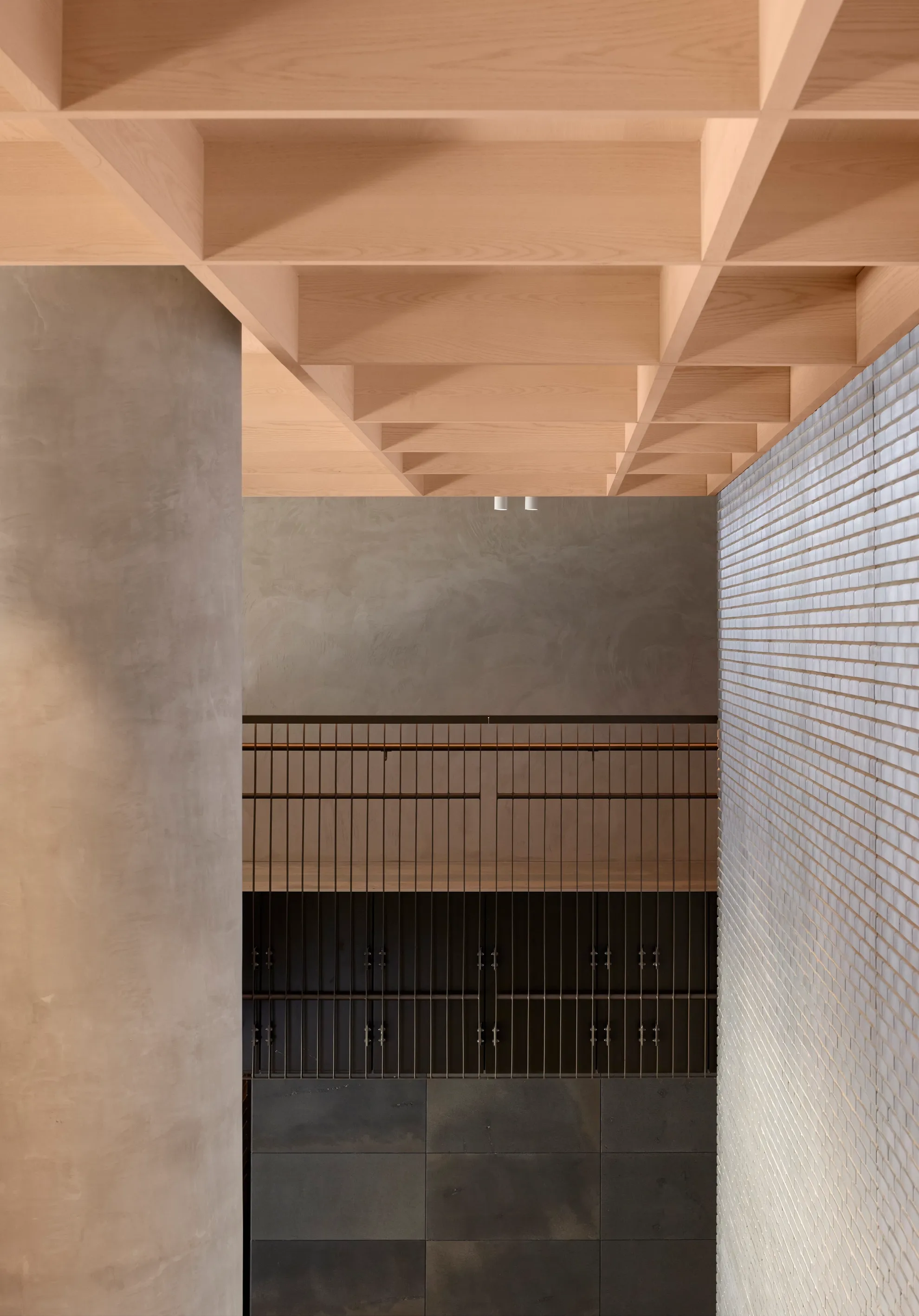 The timber ceiling echoes the building’s geometry, decreasing in scale towards the centre - a detail replicated in the bluestone floor. Curves, dark timber and bronze detailing add a layer of sensitivity and calm, coupled with green, maroon and pink accents.