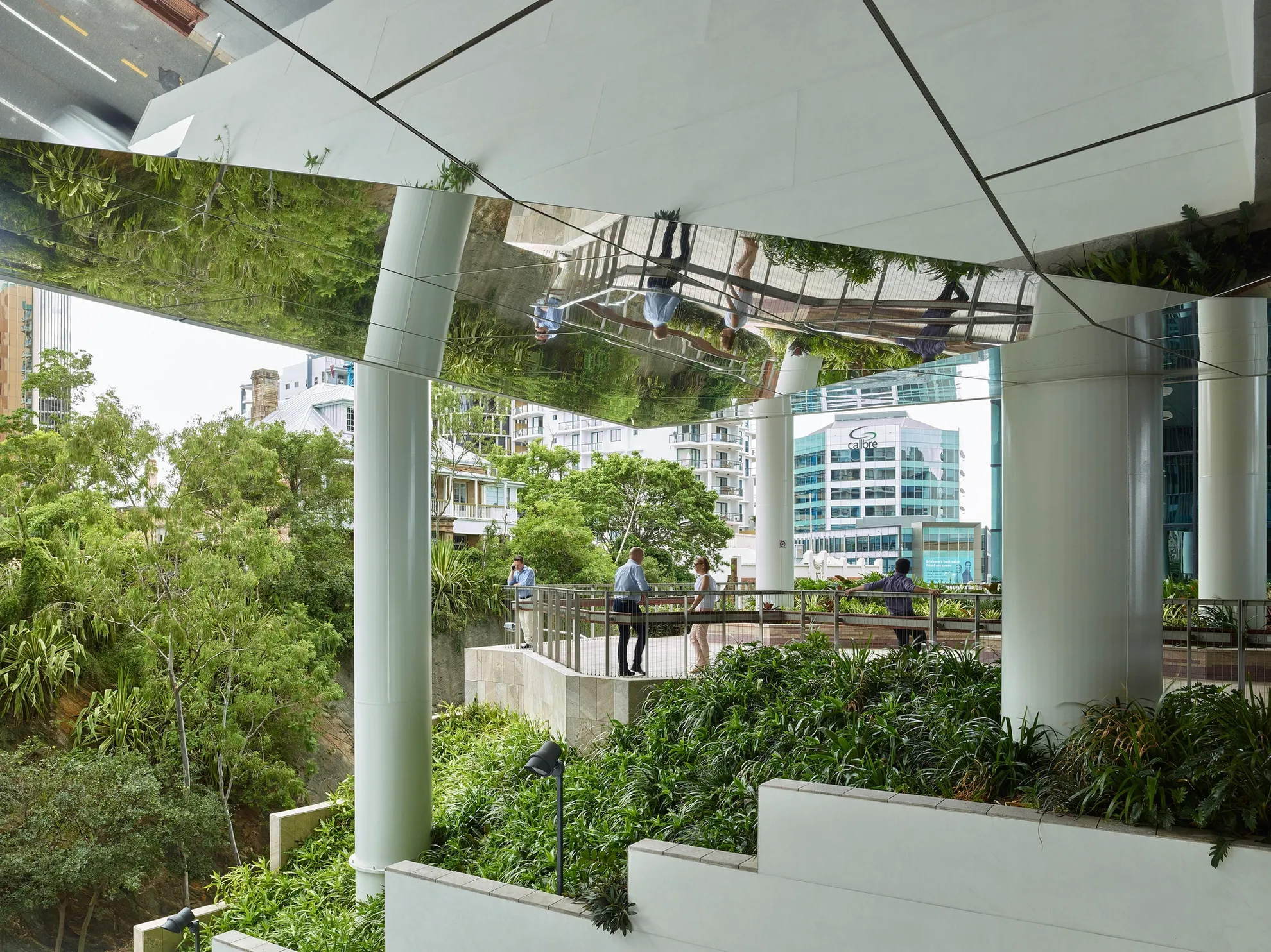 An elevated park at 480 Queen St not only brings green space into the centre of a commercial building complex, but visually connects the Adelaide Street level with the adjacent St Johns Cathedral.