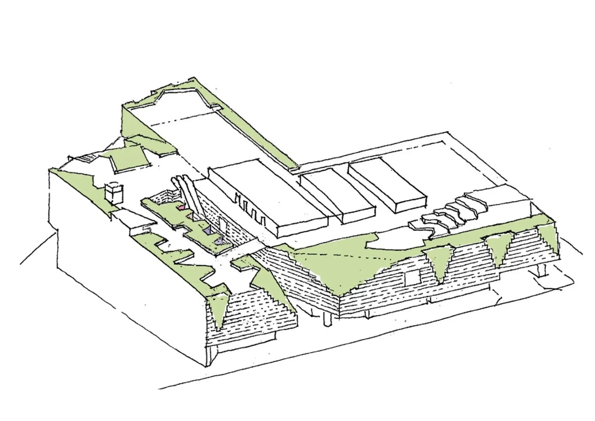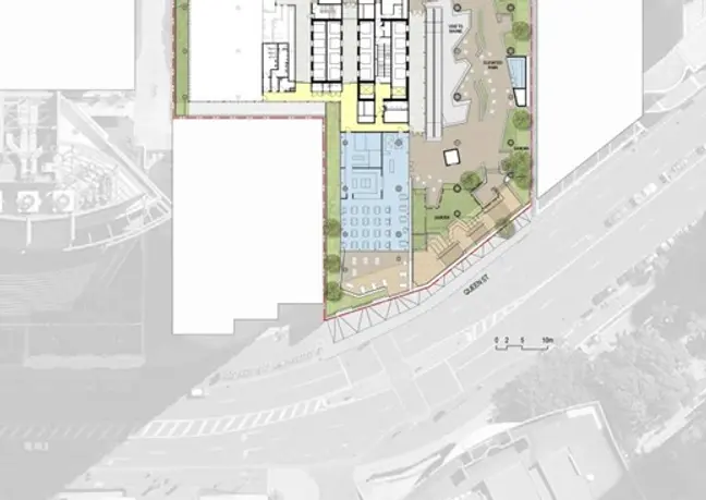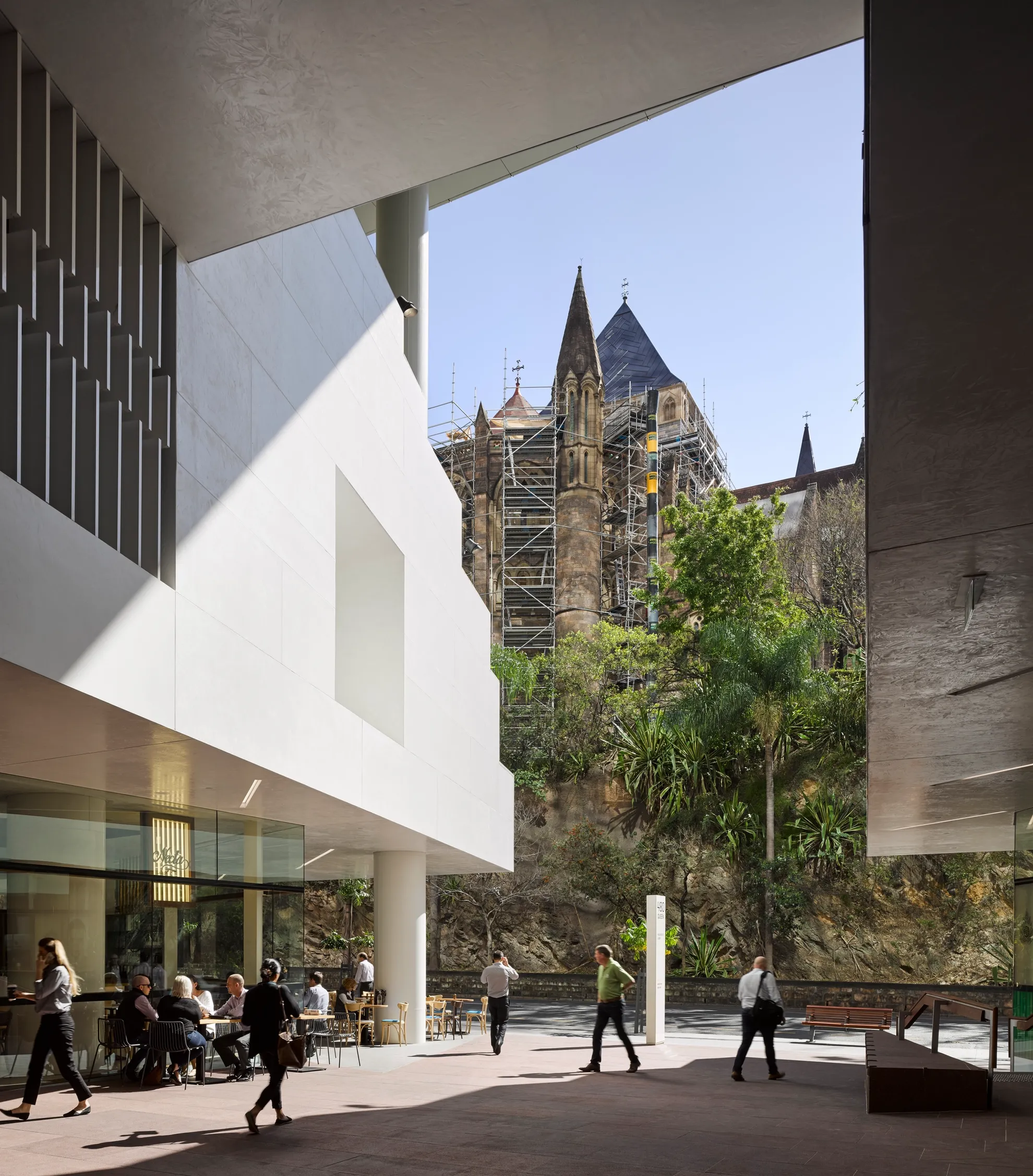 The former topography, the adjacent landscape and heritage buildings all influence the design proposition, its identity and details. The cross section illustrates the reinstated terrain, the new pedestrian connection between Adelaide and Queen Streets, and the new outlooks from the elevated podium terrain.