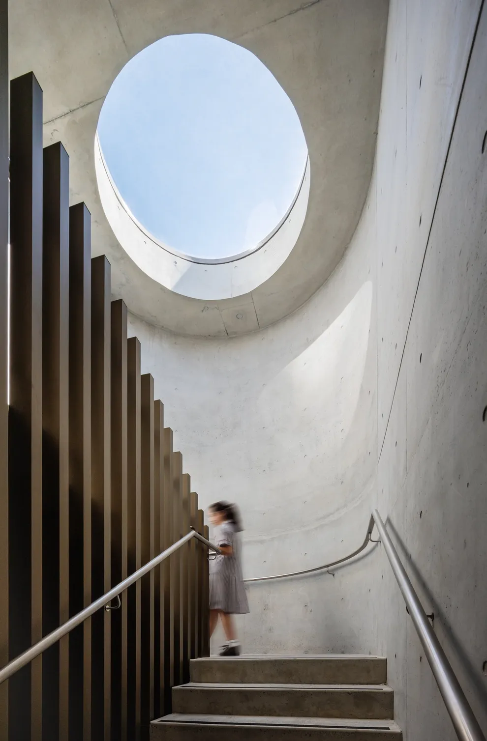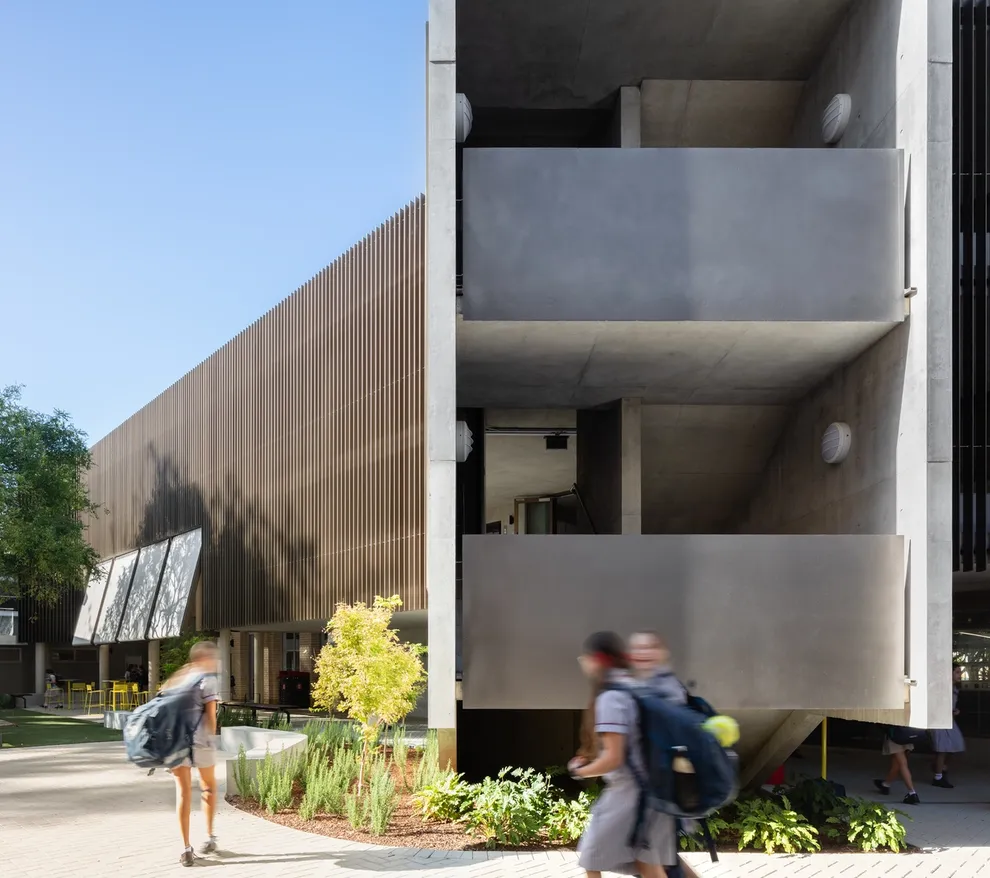 Comfortable outdoor learning spaces that complement indoor learning spaces encourage students to spill onto balconies and courtyards.