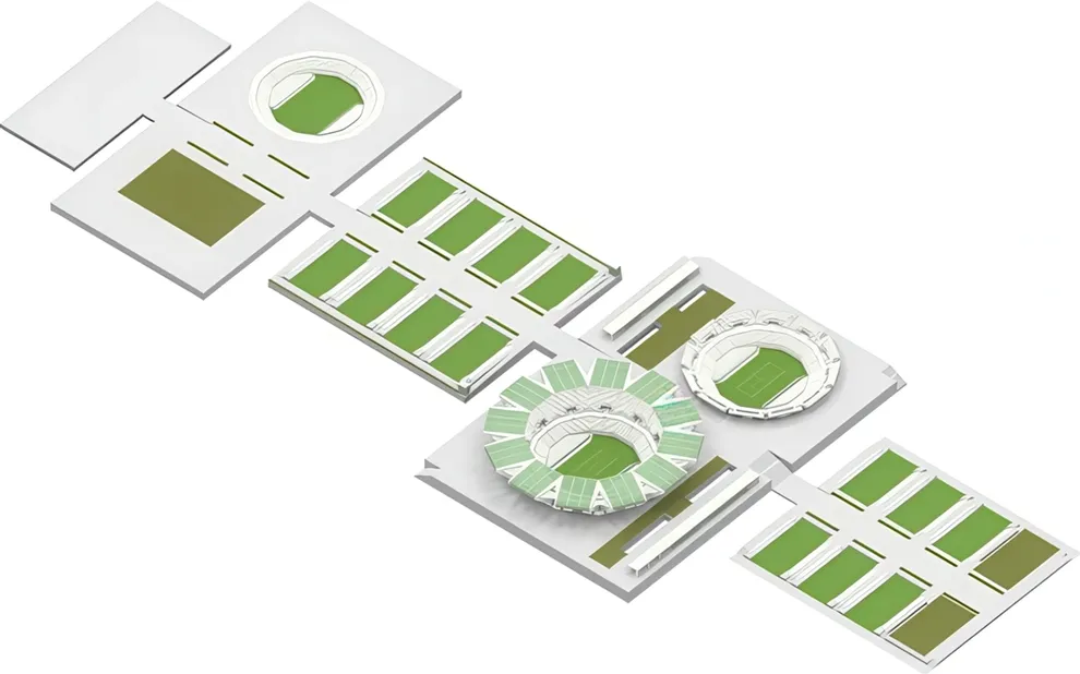 The complex is ordered by three elevated platforms connected by a central public concourse that steps up from west to east. This configuration establishes a two-level arrangement with the main public circulation at the upper level and the sunken bowls and support facilities below. As these are entered from the internal service road of Olympic Park to the east, it provides an excellent degree of operational separation ideally suited to the functional needs of any major event.