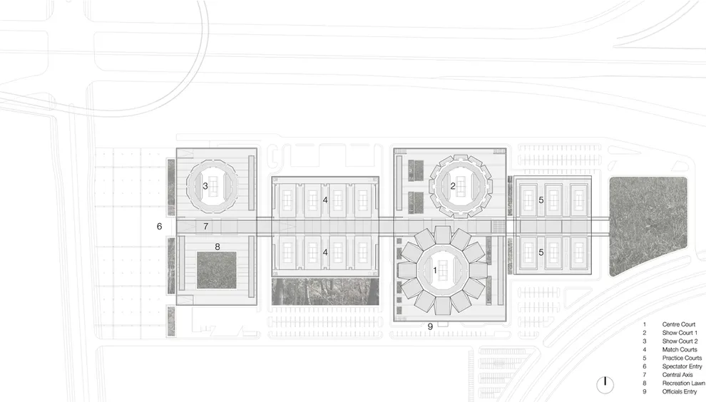 The tennis centre is both clearly organised and memorable with a symbolic and distinctive Lotus Court, the climax of the architectural composition - a direct and elegant tectonic solution. The distinction of the architecture is achieved through the expressive potential of its components articulated with a precise and efficient purpose.