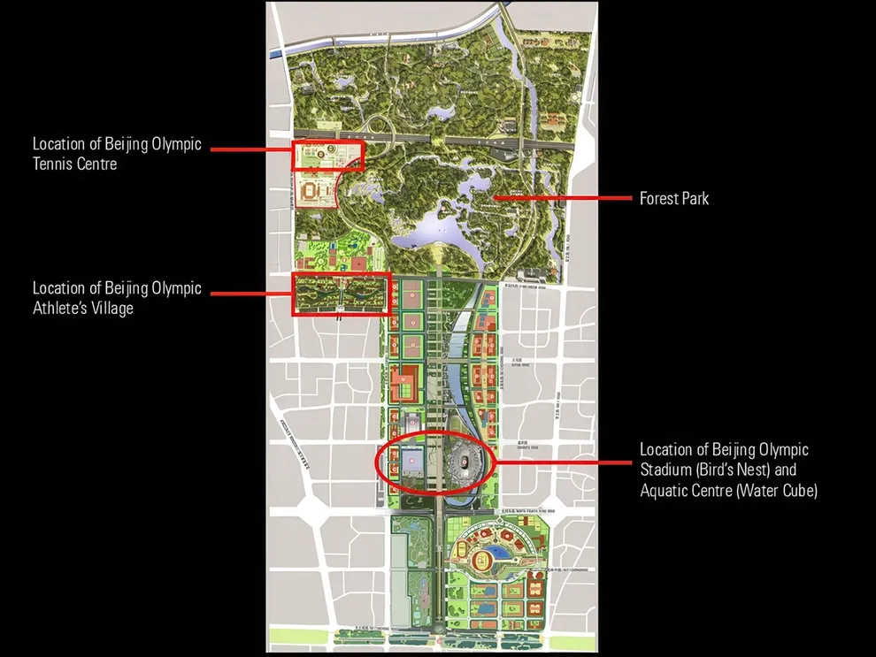 Beijing Olympic Green was created to be the centrepiece for the 2008 Olympic and Paralympic Games. Located in the north of urban Beijing, this monumental site is over 11 square kilometres in area and extends for 5 kilometres, by far the largest Olympic Games site ever created. Added significance was awarded to the site by aligning it to the city’s historical south-north cultural axis running through Tiananmen Square and the Forbidden City, thereby reinforcing the urban framework.