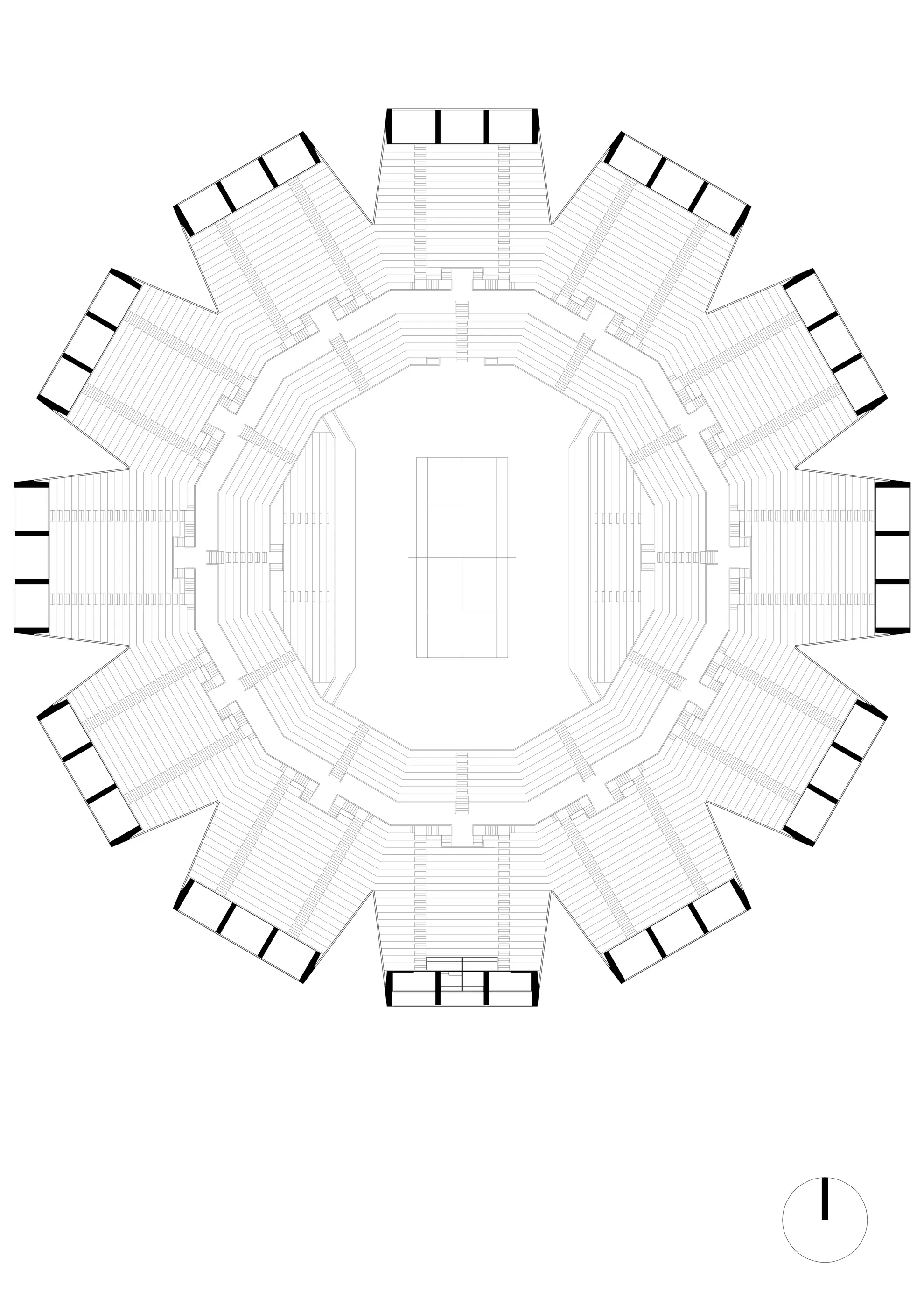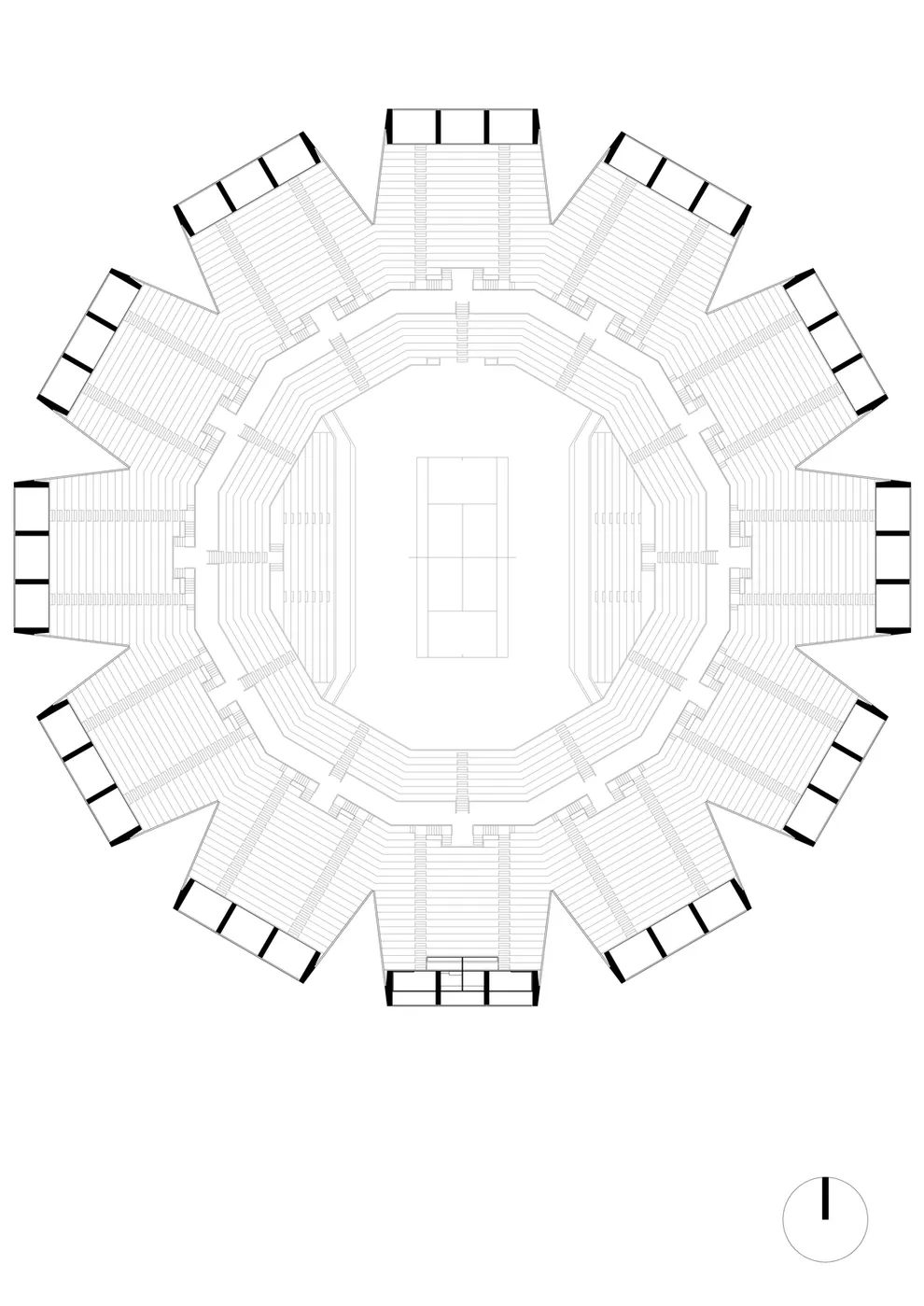 The dramatic upper bowl of Lotus Court is formed from twelve equal segments giving the stand its distinctive flower shape. The raking surfaces of the bowl fold into a dramatically cantilevering roof that shades two thirds of the seats. The openings between the segments permit views out and release heat that collects in the upper bowl, inducing a slow cyclonic airflow for the comfort of players and spectators.