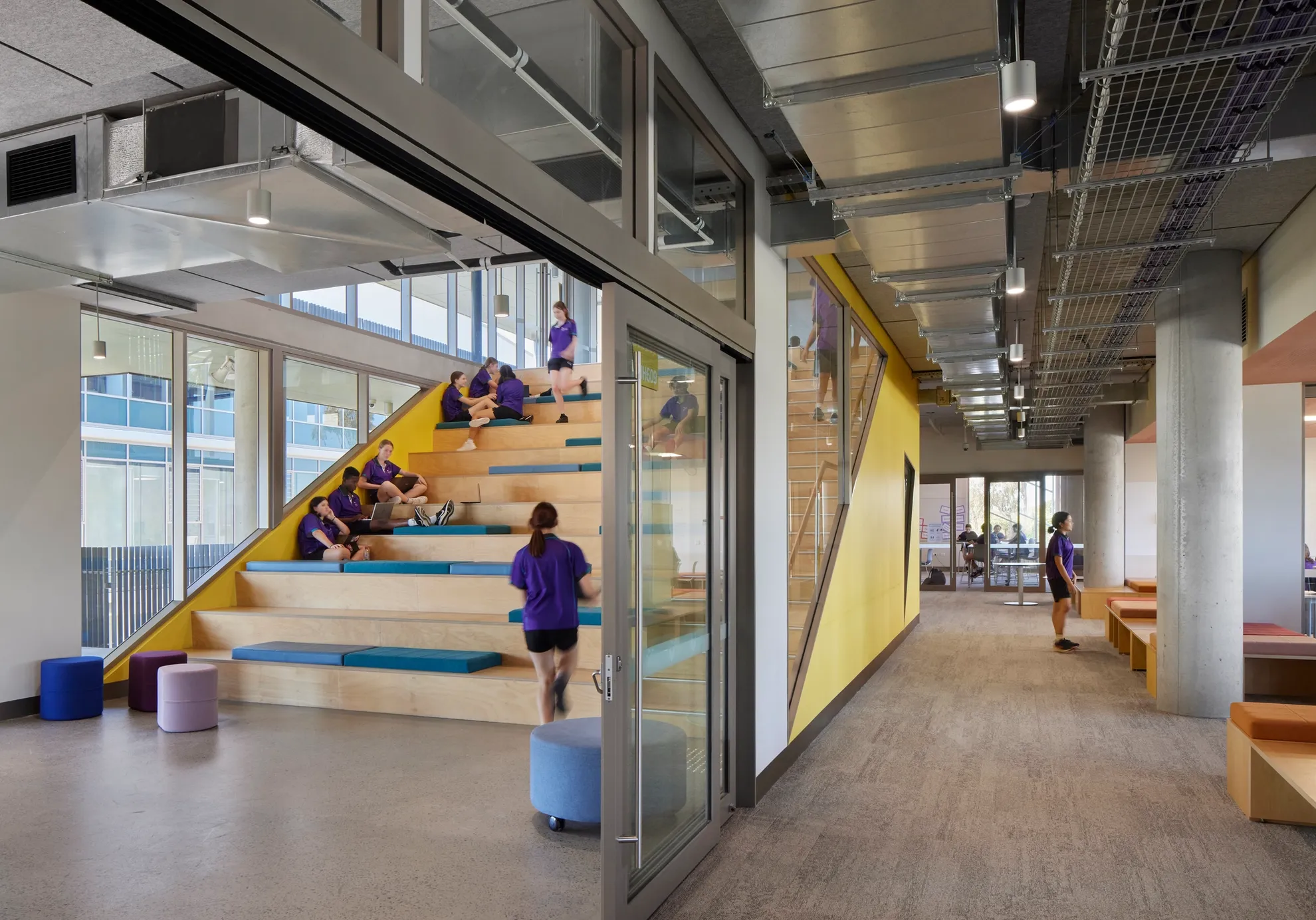 The five learning hubs that comprise the school embrace this space, opening to the north and the city view. Even though these hubs have their own educational focus, the design emphasises unity by providing connections across all levels via expansive galleries and large open stairs. These open up learning planes across buildings, positioning related facilities together and creating integrated spaces across year levels.