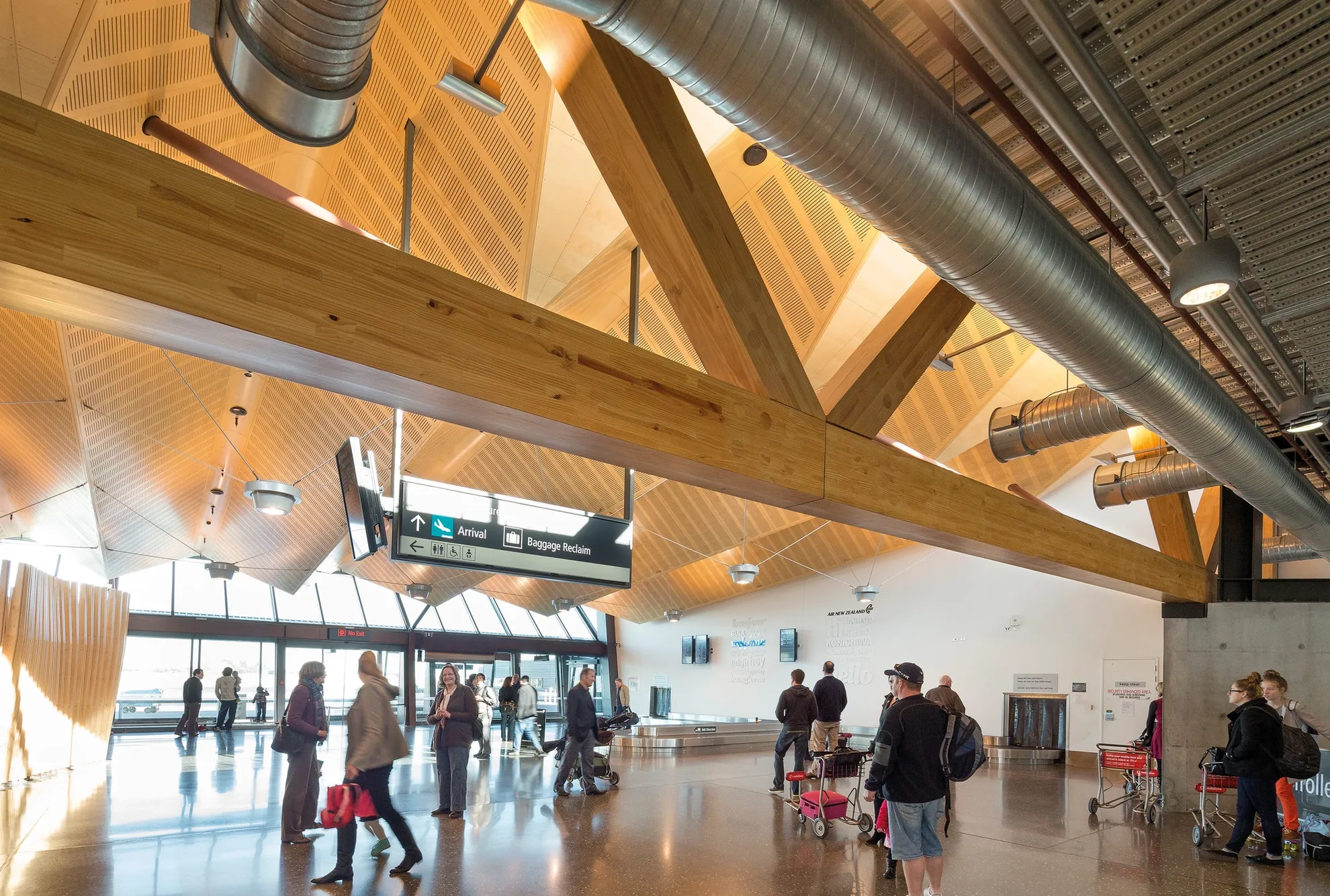With its crisp triangular folds, the ceiling is emblematic of the Southern Alps. Its large timber trusses reference wooden bridges found throughout the rugged landscape. The truss system supports high-level north glazing that allows daylight to penetrate deep inside. This structural element doubles as a dedicated goods transfer pathway from the ground level loading dock to the upper level of the domestic terminal and international retail areas.