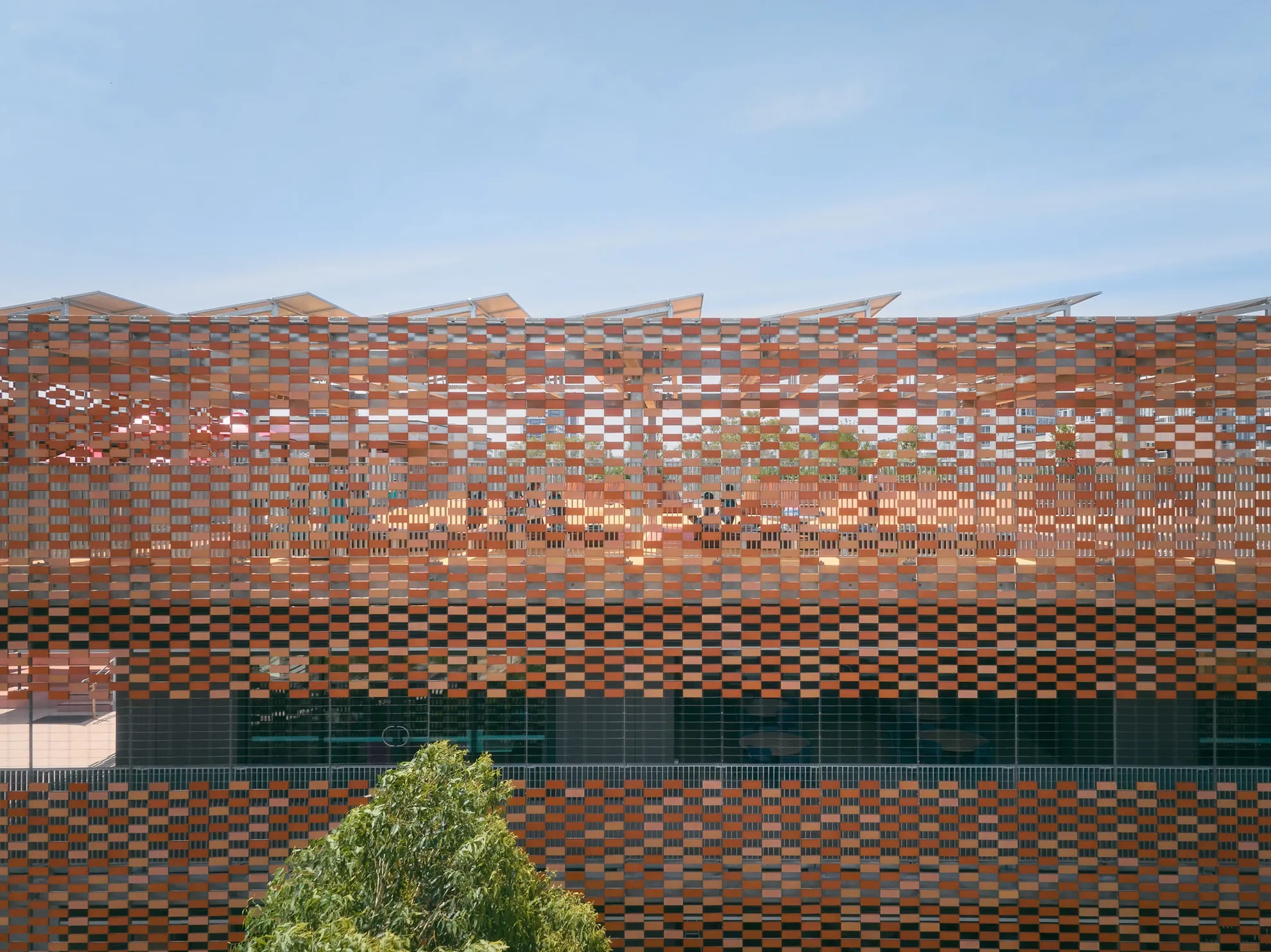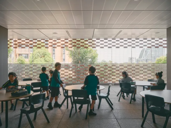 The building's distinct identity is achieved by a Flexbrick screen that wraps the structure in a loose-weave brick 'veil'. Four different shades and textures of bricks suspended on stainless steel cables reference the historic masonry buildings surviving from the former South Sydney Hospital nearby. The screen provides privacy and shade to the verandas and outdoor learning areas behind, while encouraging cool breezes to pass through.