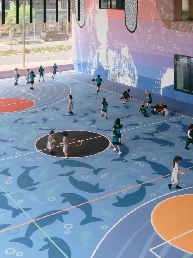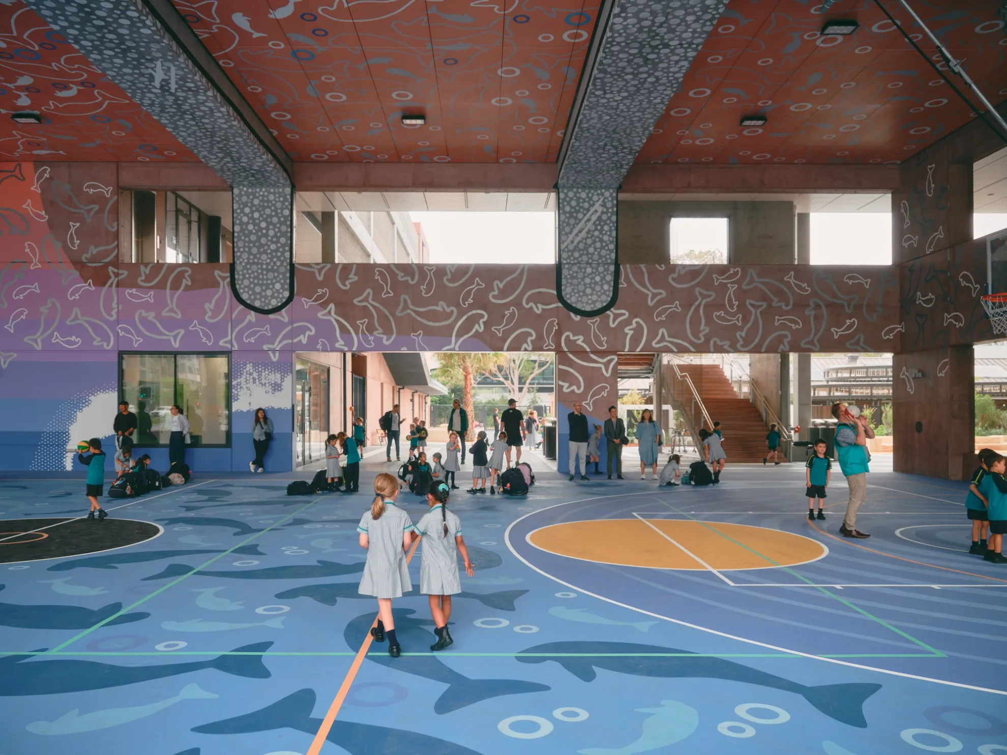 Artwork by Archibald Prize winner Blak Douglas called The Belly of the Feast is painted across the sports court. It draws inspiration from the 6,000-year-old hatchet-marked dugong bones unearthed nearby in 1896.