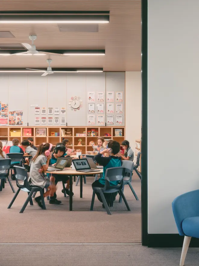 The four-storey facility takes 600 local students from Kindergarten to Year 6 and integrates community spaces to extend the life of the school until 10pm, 7 days/ week. Levels One, Two and Three are reserved for students while the Ground Floor combines dedicated community spaces with sports courts and facilities shared between the school, Outside School Hours Care (OSHC) and community groups.