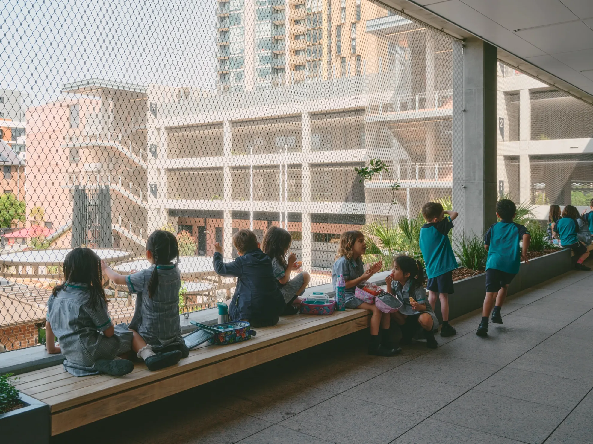 The building's distinct identity is achieved by a Flexbrick screen that wraps the structure in a loose-weave brick 'veil'. Four different shades and textures of bricks suspended on stainless steel cables reference the historic masonry buildings surviving from the former South Sydney Hospital nearby. The screen provides privacy and shade to the verandas and outdoor learning areas behind, while encouraging cool breezes to pass through.