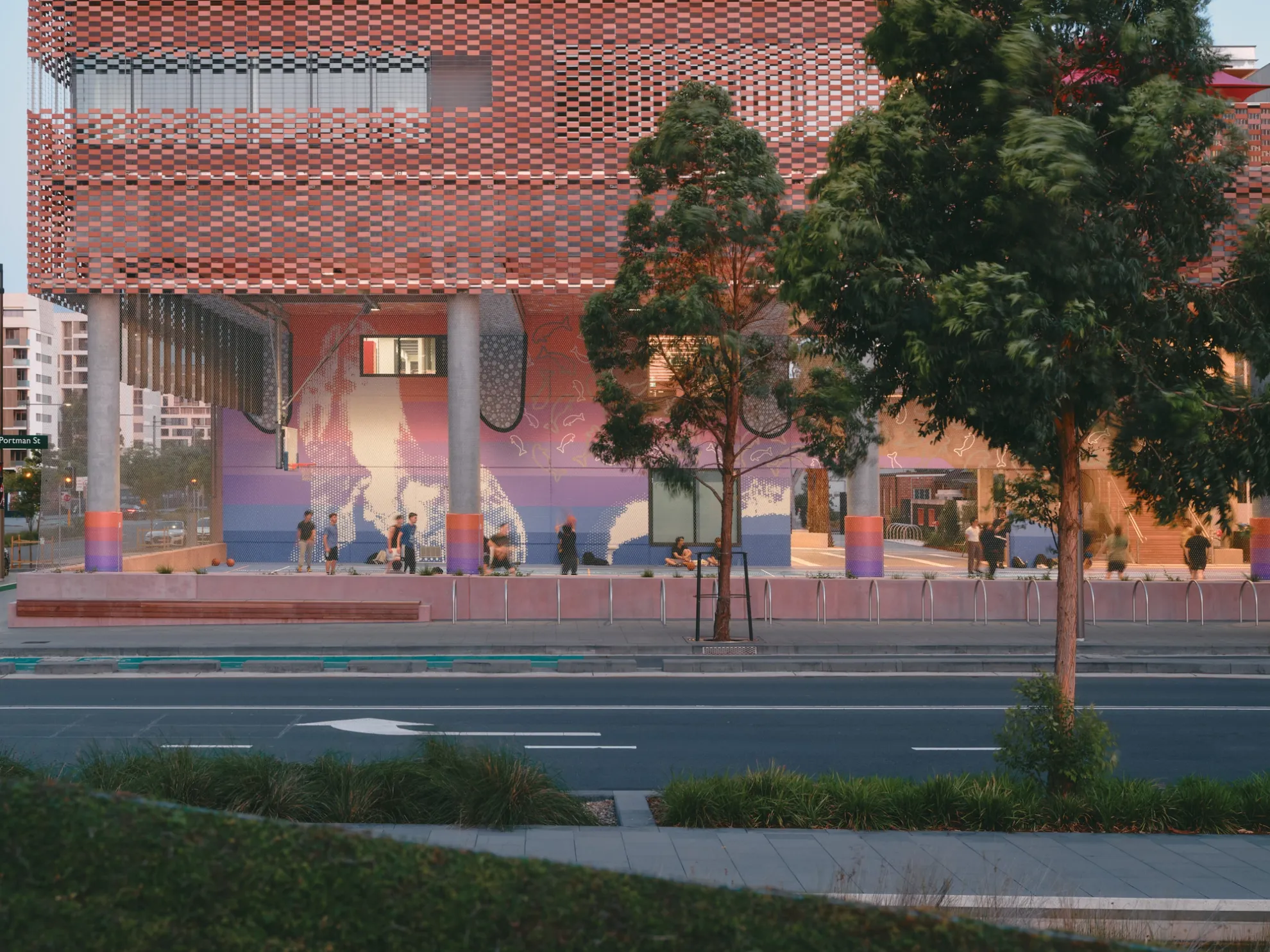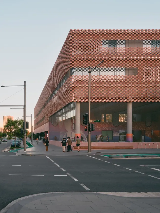 A key design move made to encourage community use of shared facilities was moving the multipurpose games court from the rooftop to street level. Games and events now activate the visually prominent street corner which is further enlivened by First Nations storytelling with a landmark artwork by Archibald Prize winner Blak Douglas. The Belly of the Feast transforms the courts' walls, floors and ceilings into a striking mural, signposting it for community use.