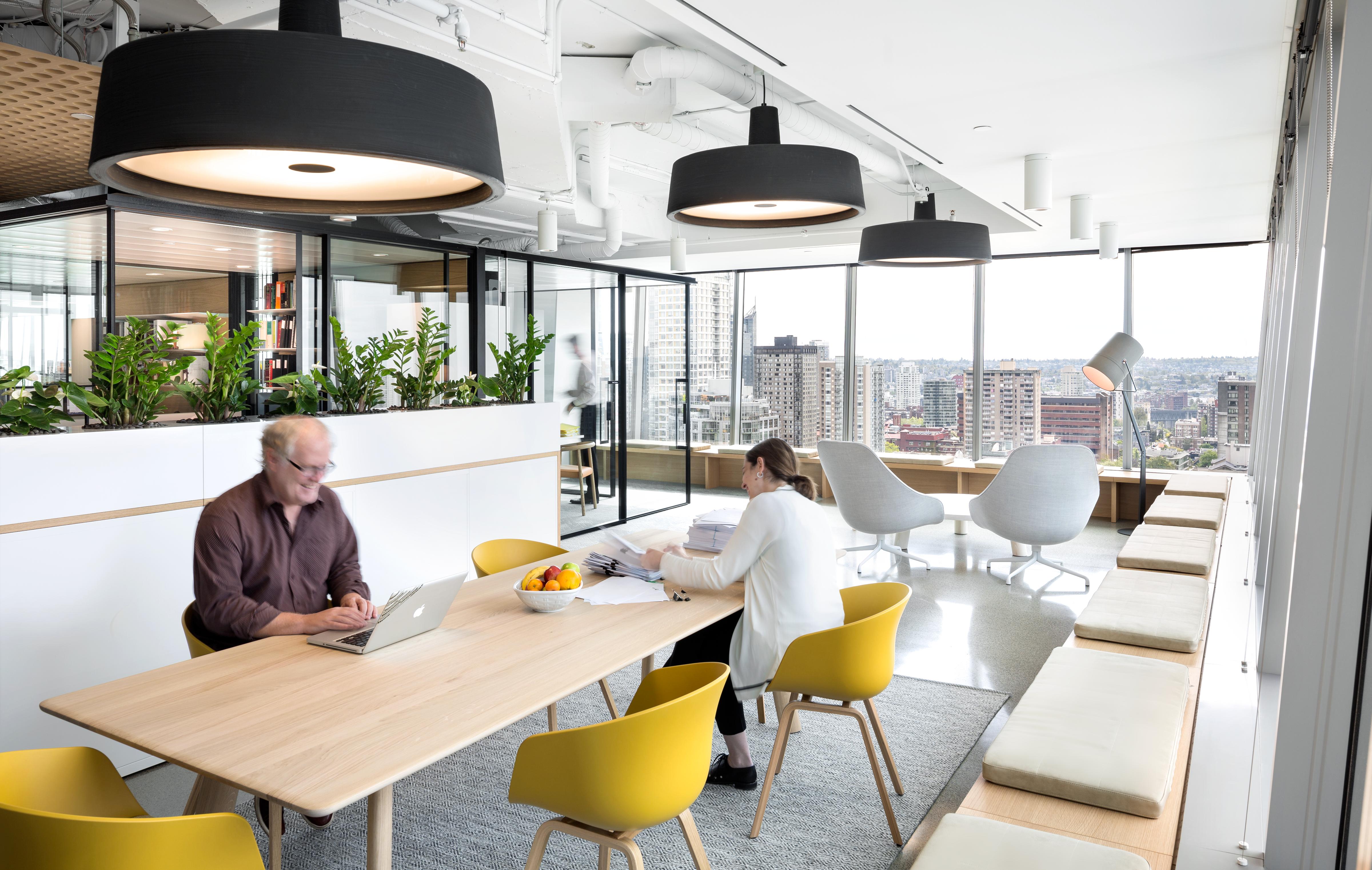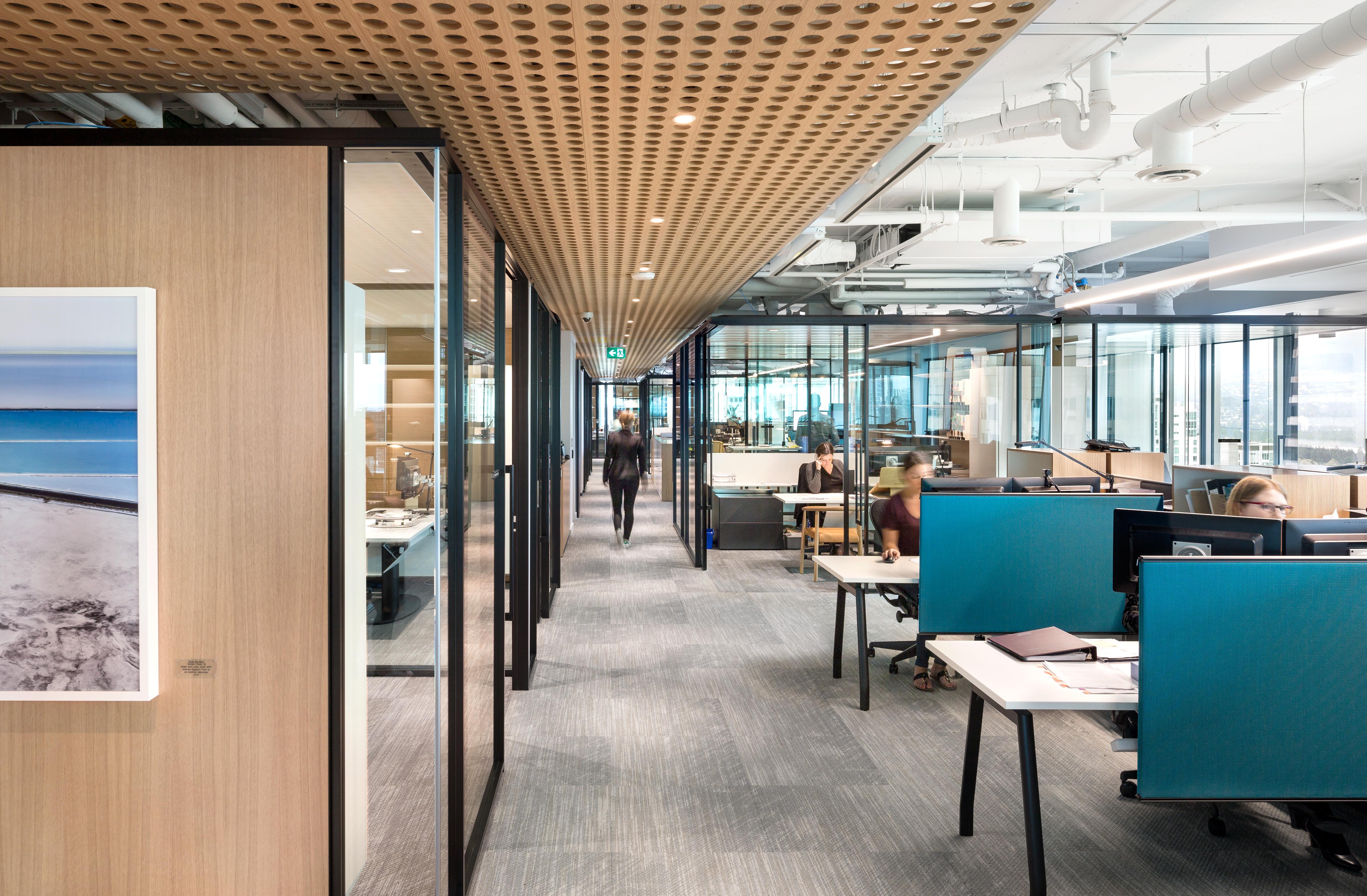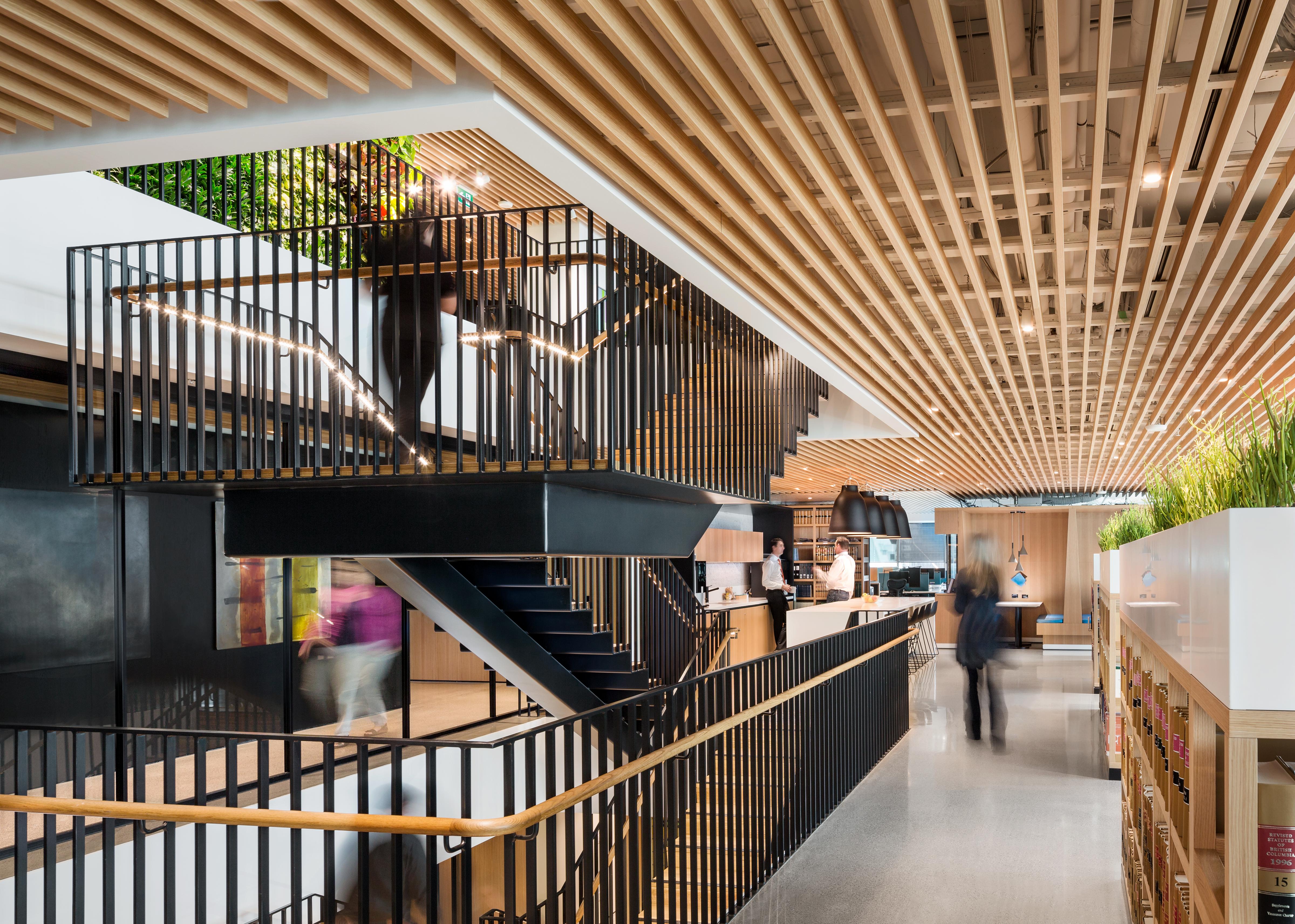 In the new Vancouver workplace for McCarthy Tetrault, lawyers from multiple-sized offices have been relocated into a single-sized office spanning three floors. It's set within a new building at 745 Thurlow Street.