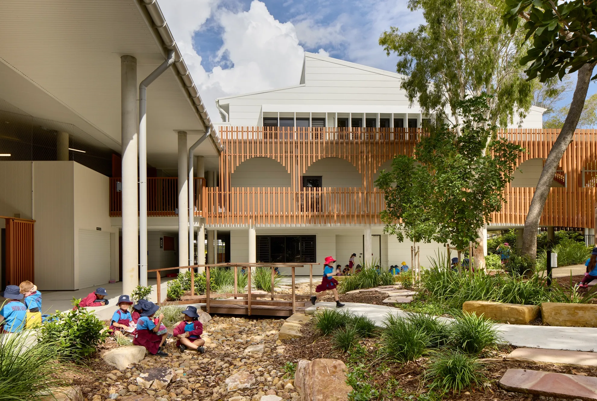 Surrounded by sub-tropical landscaping, the new buildings draw inspiration from climate-hardy Queenslander homes, with deep verandahs and low eaves marking their north-west facades, and angled sunshade hoods protecting the south-west windows.
