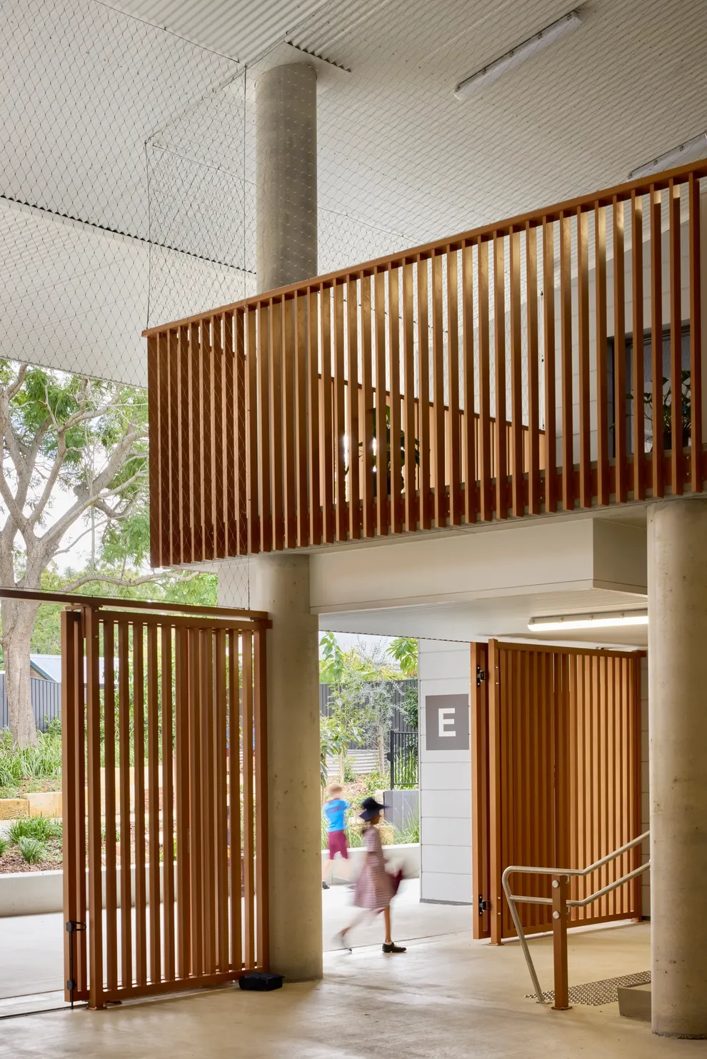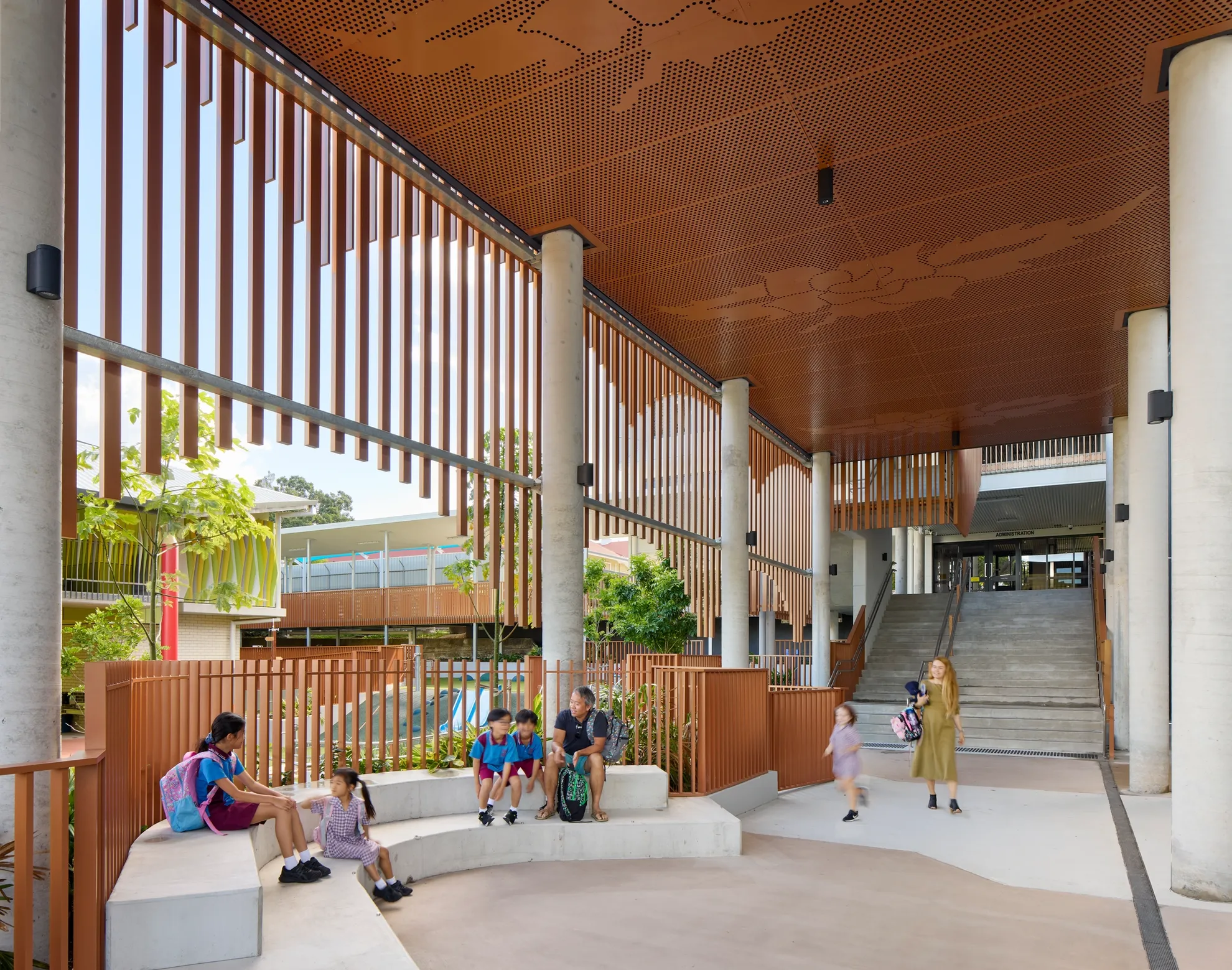 To invite parent and community participation, we introduced a welcoming arrival space and a community promenade, linking the new Annie Street drop-off to the new administration building reception.
