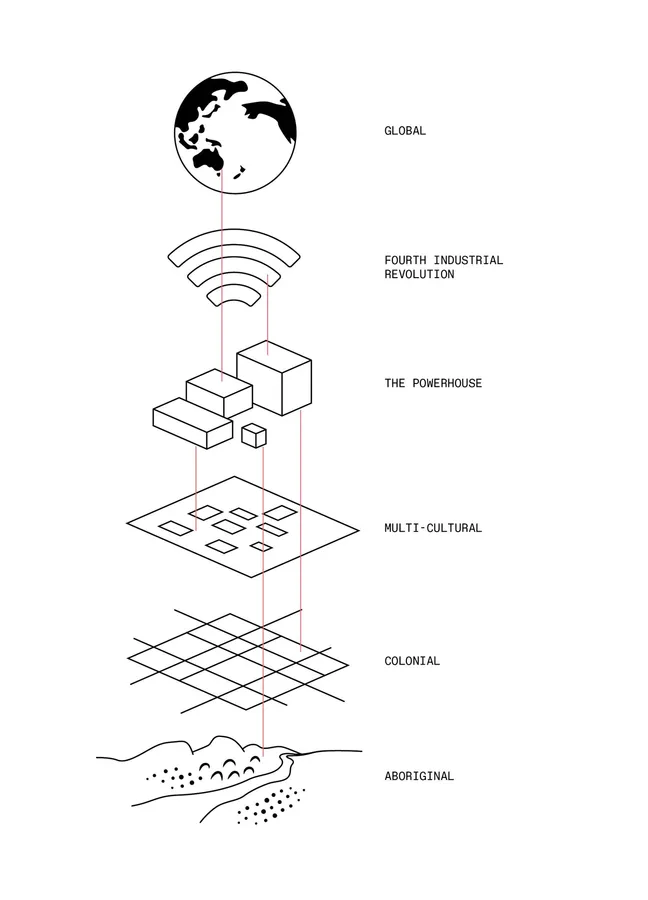 We began by looking back; to connect Aboriginal custodianship, colonial infrastructure, and multi-cultural ideas. Then look forward, harnessing technology to connect human and industrial activity at local, national and global scales. Our goal was to create a place that encourages conversation, discussion and shared understanding.