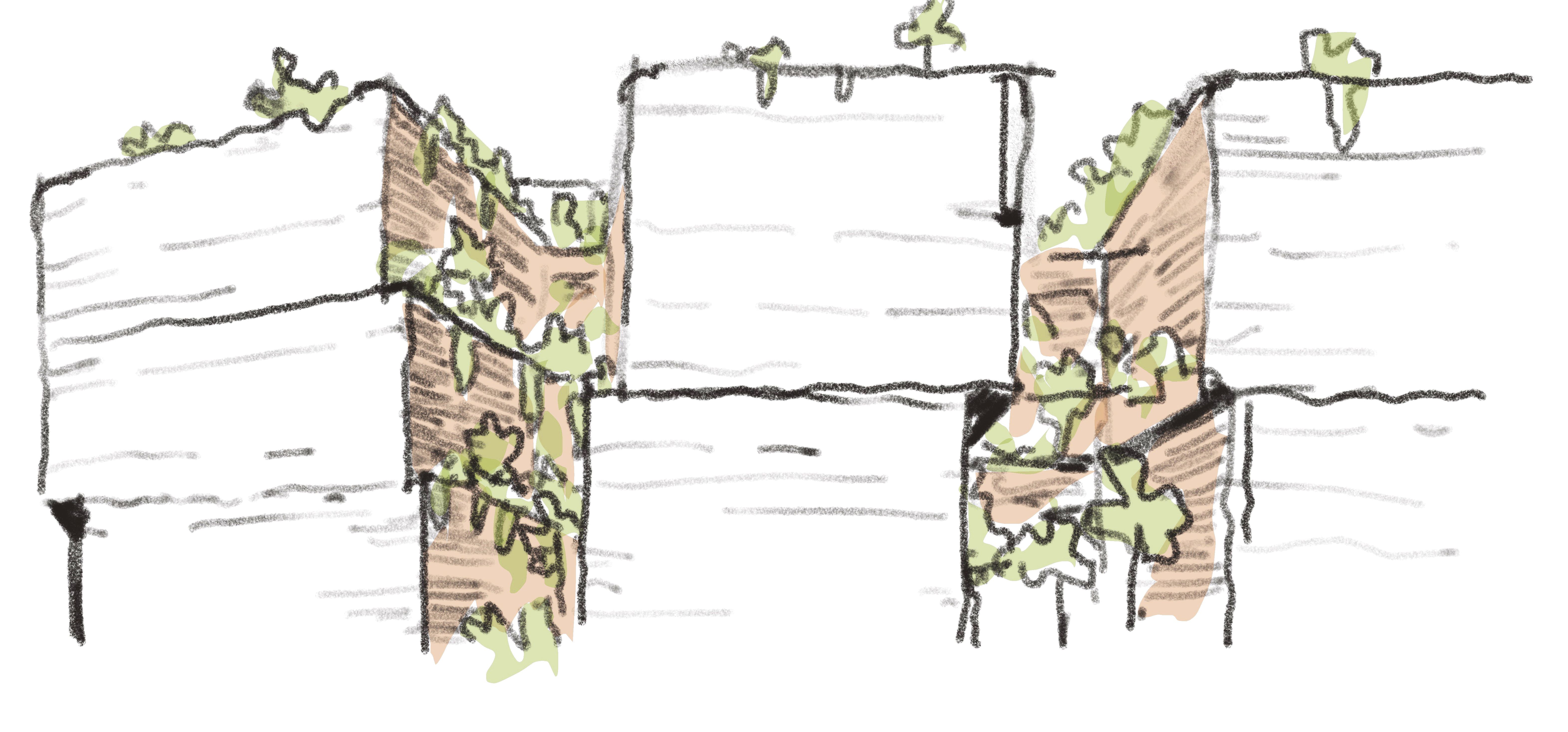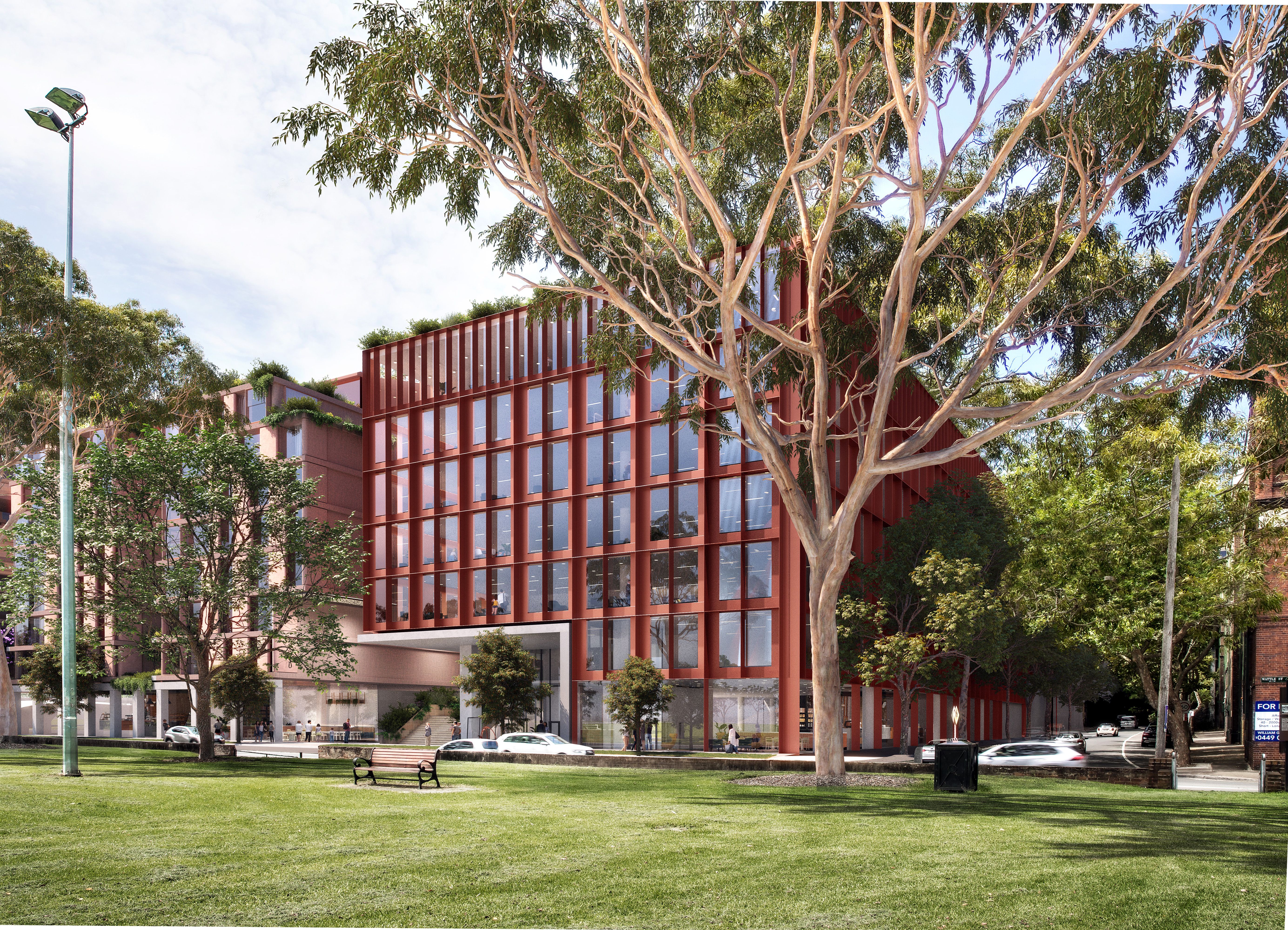 The four separate buildings are arranged around a large central courtyard. The three street-facing buildings mirror the character of their opposing neighbours in scale, form, texture and colour. Open to the north, merging its densely planted park with the trees alongside thelight rail, the north-south pedestrian link invites people to flow through the site. Along this journey, the Hawkesbury sandstone of the old quarry appears illuminated from above as it comes into view across the subterranean sports hall. The childcare centre, also sunken slightly below the street, connects to the northern park and overlooks the internal courtyard, gaining light and outlook in two directions.