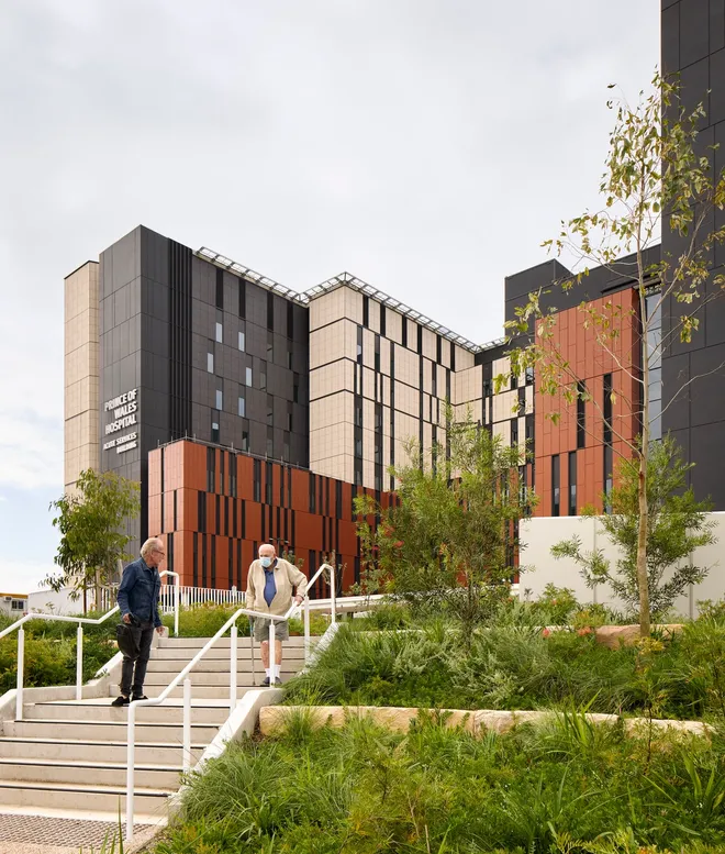The overhanging roof, brick base, playful window placement and use of colour all work together to project domestic characteristics and create a welcoming and recognisable presence within the hospital precinct.