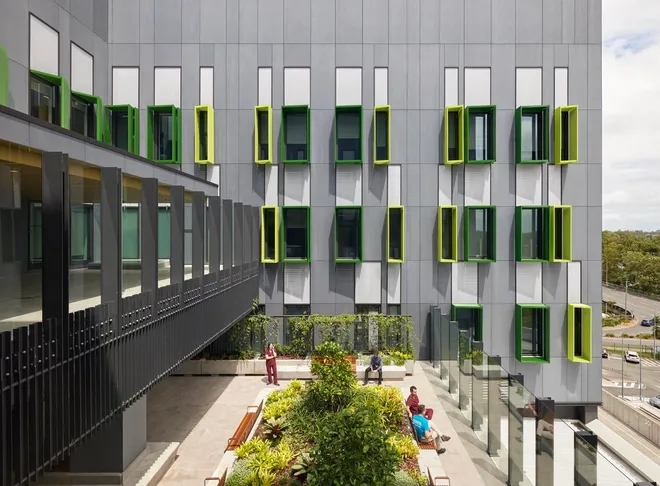 The L-shaped building embraces a courtyard garden accessible from major communal spaces overlooked by many rooms. From its prominent site, long views across the CBD and Southbank Parklands connect residents to the city and nearby amenities.
