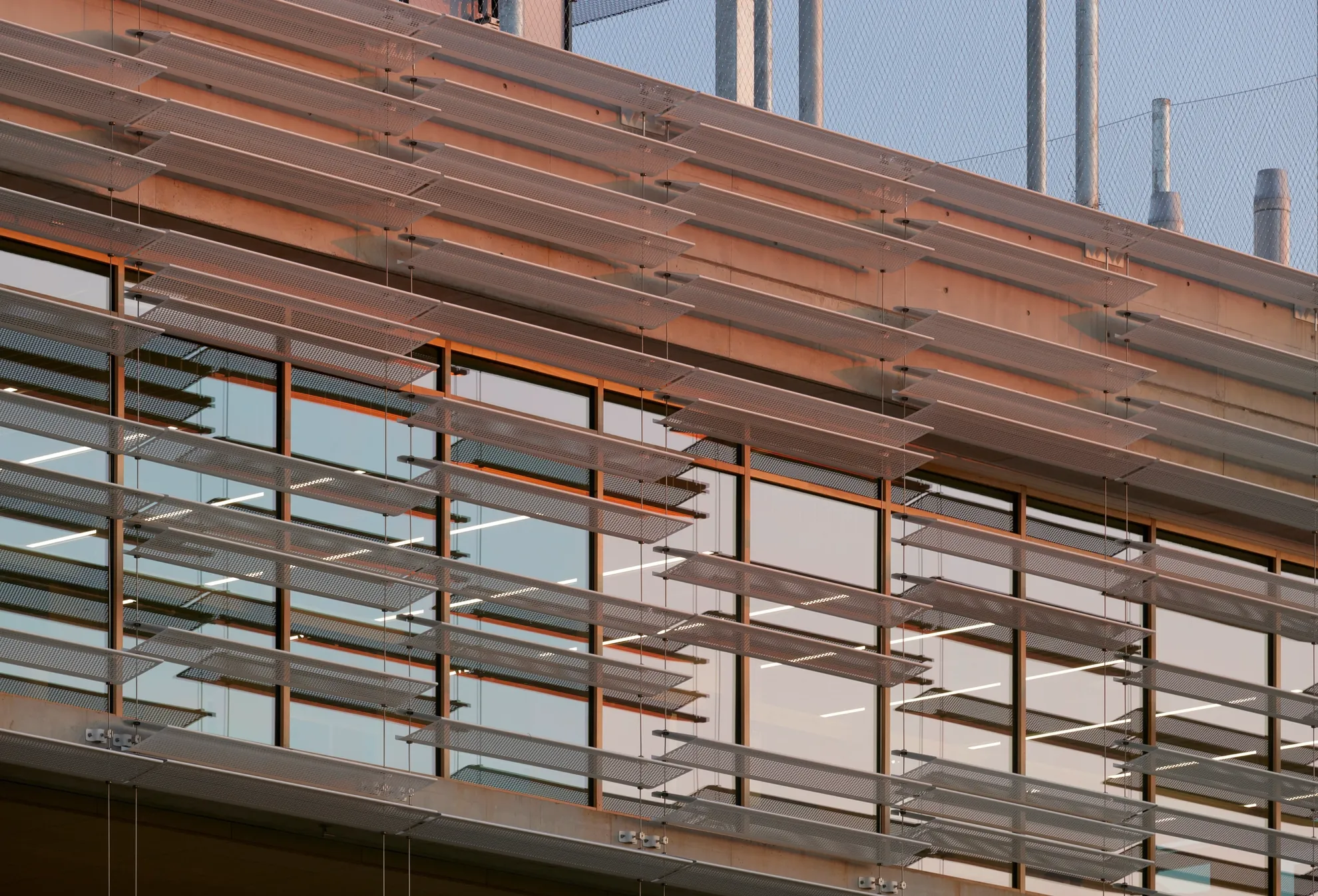 The perforated aluminium blades shade a system of glass windows with operable sections to facilitate natural ventilation. The concertina-like screens provide an ephemeral vail, imbuing the facade with a sense of movement.