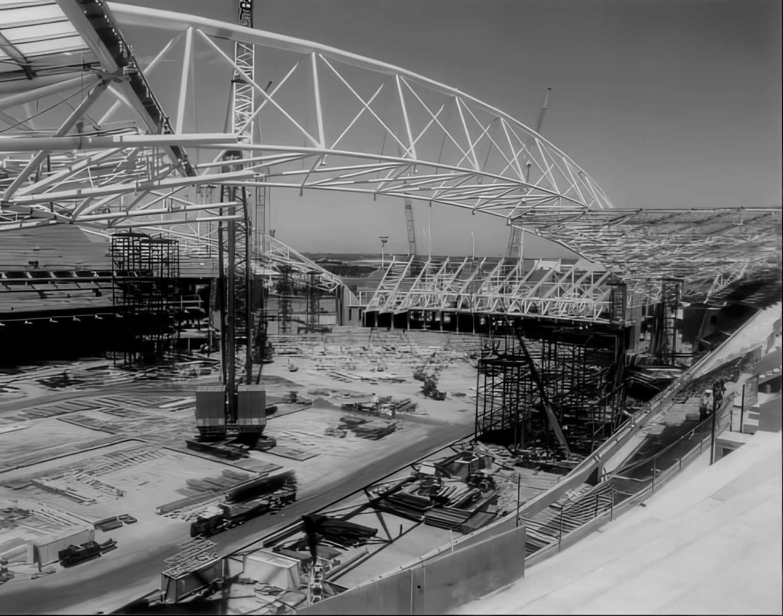 The architecture and structure were significant contributors to Bligh Lobb securing the project. Simple and powerful geometric devices provide the structural solution and define its memorable form. The high seating capacity is accommodated in a 275 metre diameter plan with the majority of the crowd on the east and west. Two massive hyperbolic paraboloid trussed arches support the leading edges of the roof Arch being manouvered into its springing point at one end. Arch trusses during construction.