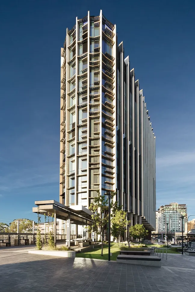 The building utilises the strength of its external structural frame in its form, articulation, and sun-shading, with perimeter precast columns forming a strong vertical definition. Conceived as expressed load-bearing precast, the columns extend beyond the roofline and terminate in a profile against the sky.